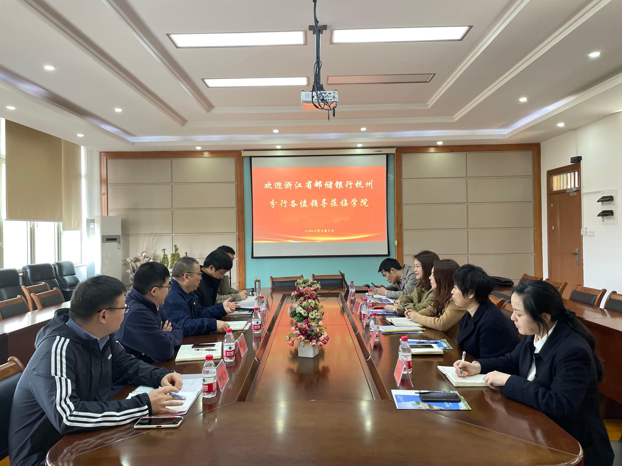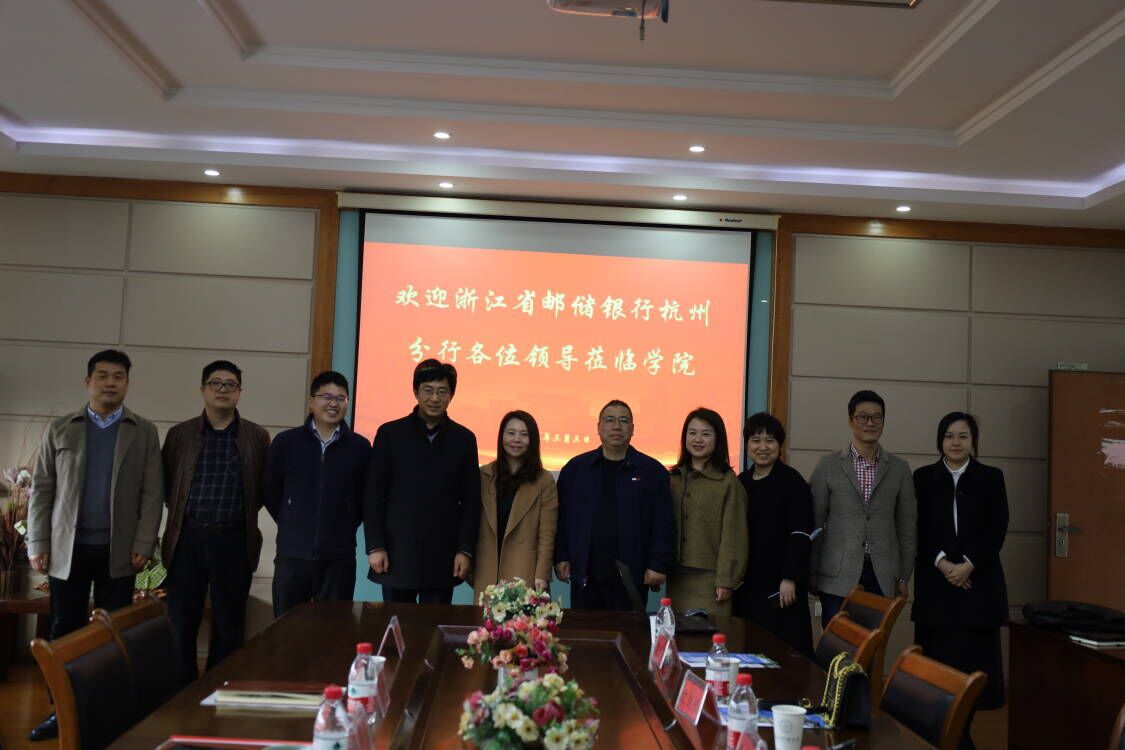 3月3日下午,浙江省邮储银行杭州市分行副行长虞晗华、副行长方锐帆、信用卡部负责人炳珊珊、下沙支行行长吕力焕和副行长冯晓清一行来院考察交流,学院党委书记黄卫华、院长王建明、教工党支部书记包兴、社会合作办主任黄纯、校友办主任杨文超、学生党支部书记何俊杰参加座谈会,会议由黄卫华书记主持。