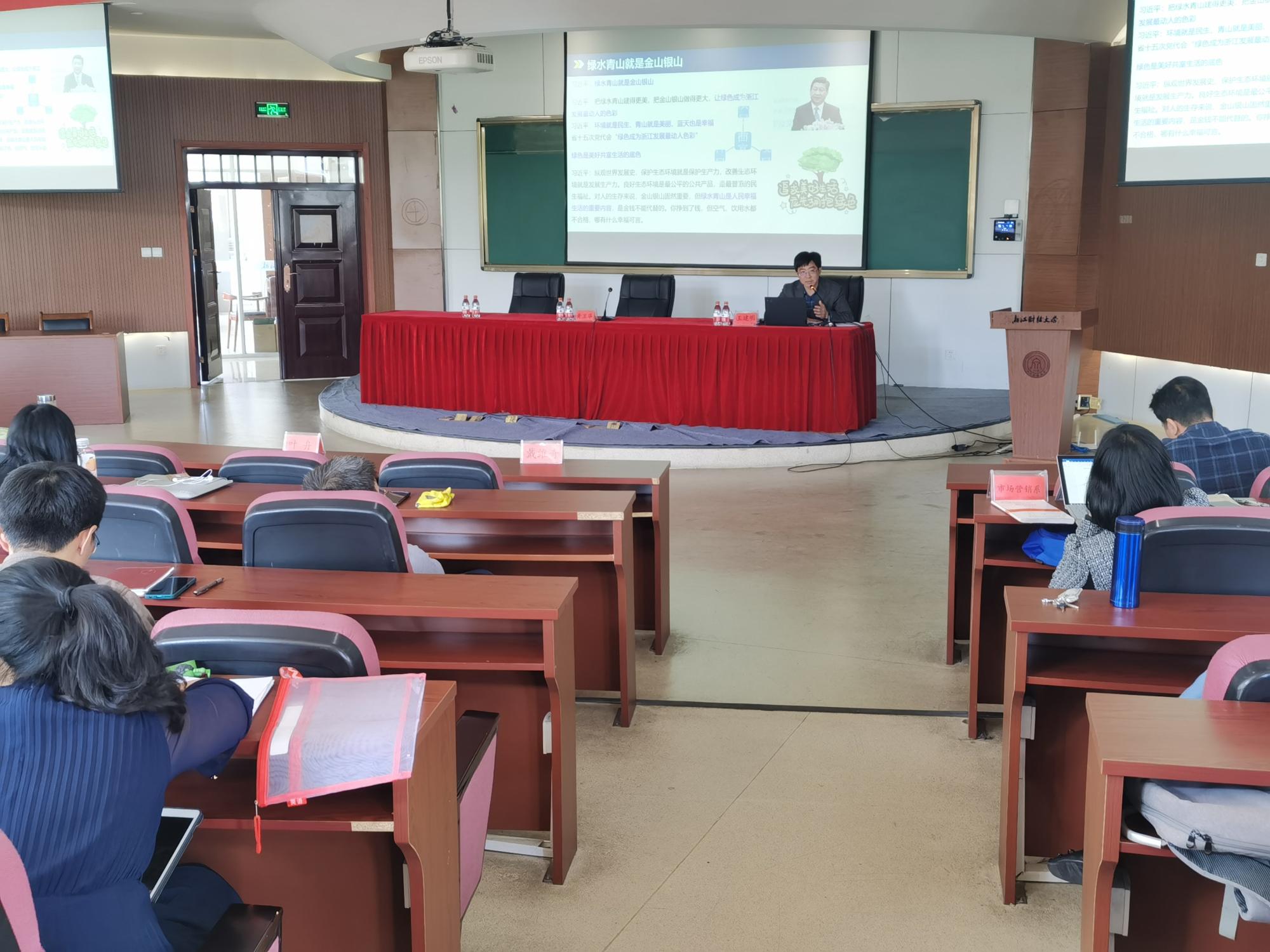 在学院楼217报告厅召开深入开展习近平新时代中国特色社会主义思想主题教育集体学习活动。学院院长王建明以“两山”理念的提出及其科学内涵为主题给大家做了学习报告。学院全体教职工党员参加学习,会议由工商香蕉视频