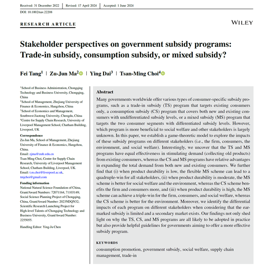 马祖军教授与其合作者的研究成果“Stakeholder perspectives on government subsidy programs: Trade-in subsidy, consumption subsidy, or mixed subsidy?”(论文链接://onlinelibrary.wiley.com/doi/10.1002/nav.22208)。