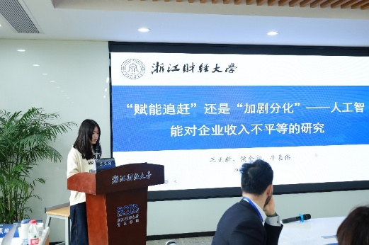 经济学院侯会湘同学以《“赋能追赶”还是“加剧分化”——人工智能对企业收入不平等的研究》为题汇报。研究聚焦人工智能技术对企业间收入不平等的影响效应与传导机制,将人工智能引入工资分解模型,揭示了经济租金与人力资本结构两大作用路径。香蕉视频