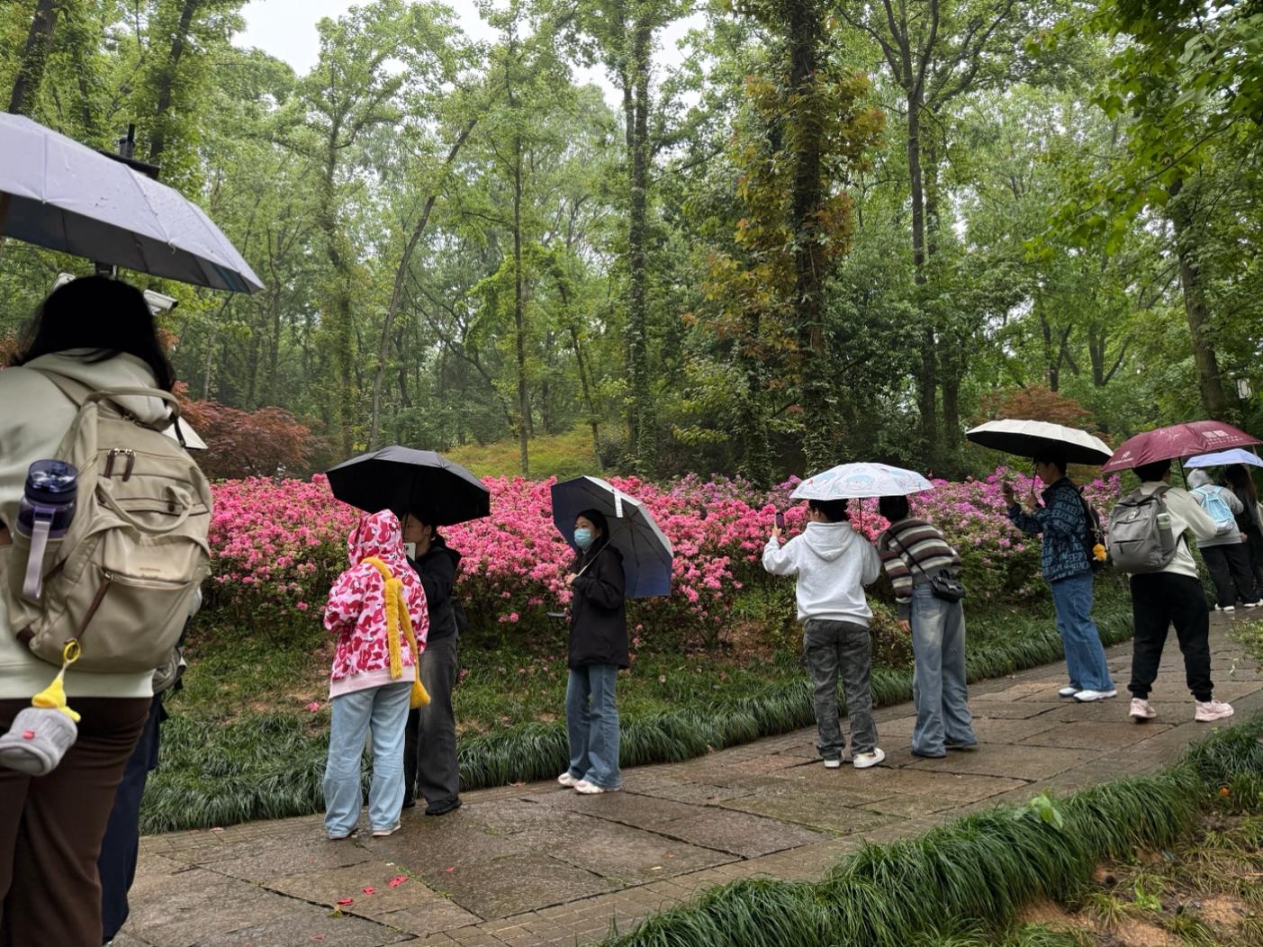 四月的塔山公园,仿佛被大自然打翻了调色盘,杜鹃谷正值盛放,粉、红、紫、白各色花朵层层叠叠,交织成一片绚烂的“莫奈花园”。这里绿意葱茏,春意正浓,是此次实践活动最生动的课堂。根据活动规则,学生们围绕“余杭春日解DONG计划”,展开了半开放式的创意创作。学生们不仅是游客,更是这片盎然春色的记录者与传播者。“这里的杜鹃花海太震撼了,色彩饱满得完全不需要滤镜,随手一拍就是大片。”一位在花径间拍摄素材的学生说道。