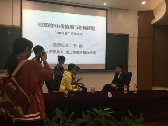 校友方彬“回家”后与在校生谈起他的职业经历。从毕业离校第一份工作遇到的困难,到十年后成为锐思科集团高级合伙人,方彬用自身经历告诫在校生职场并非一帆风顺,要以积极的心态面对挫折,不断总结以提升自我。在人工智能时代,很多事务性工作被机器人替代,方彬认为只有不断加强专业学习,增加自己的“稀缺性”,方可获得持久竞争力。他坦言:“作为一个HR,具备经营性HR思维、提升共情能力和终生学习,才能适应新时代的浪潮。”