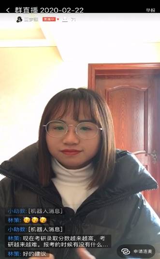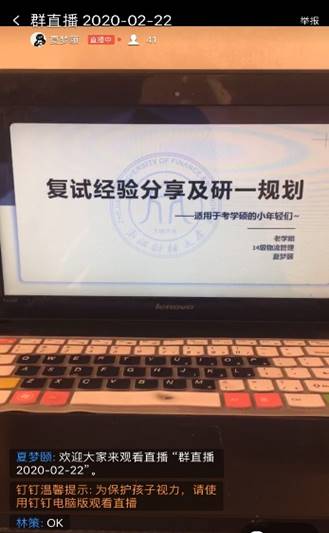 “新一届的考研成绩刚刚出炉,在这个抗击疫情的特殊时期,本想针对物流专业的学弟学妹备战复试直播答疑,没想到一下吸引了那么多同学的在线观看。”目前就读于福州大学、原2018届物流管理毕业生夏梦颐这样谈到。如何在抗击疫情的特殊时期,做好“停课不停学”;如何更加挖掘学生现实需求并开展线上直播教学,是物流系全体教师正在探索的内容。2020年2月22日下午,为了更直接的帮助专业毕业生备战复试,物流系邀请了三位优秀毕业生在“钉钉”平台直播方式分享了考研复试的相关经验,为备战复试的学弟学妹答题解惑。短短一个多小时的时间,共计一百五十余人次观看了直播分享。