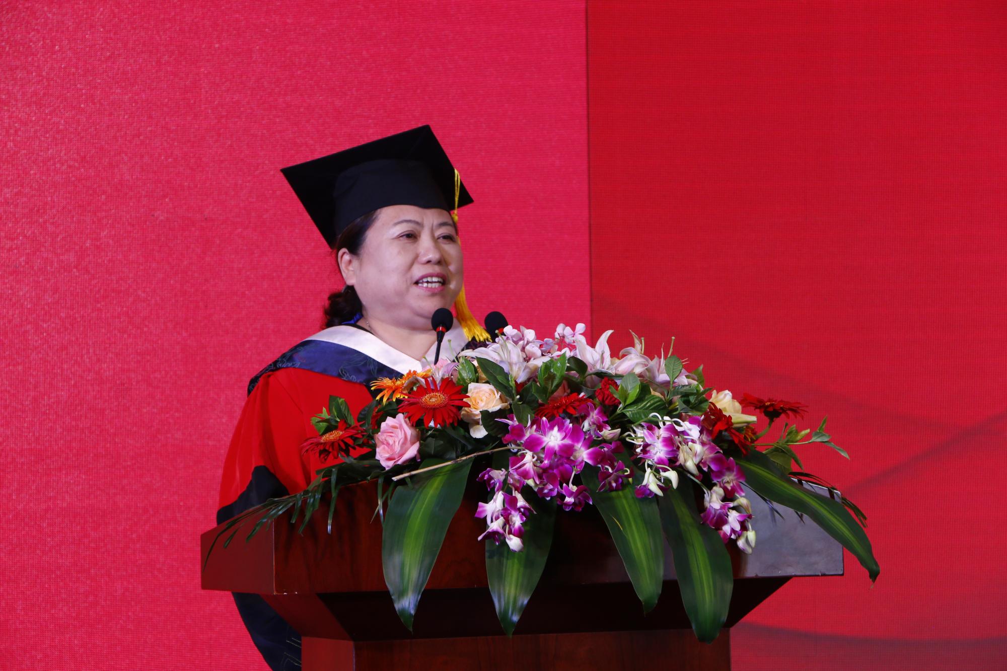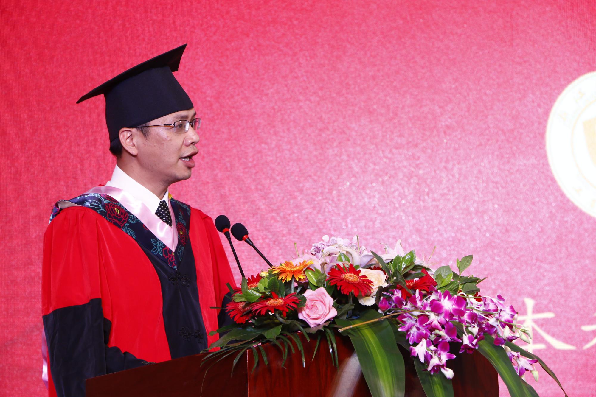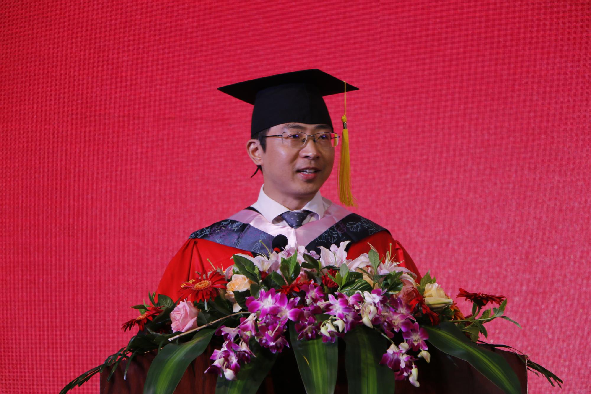 首先,王建明进行了致辞。王建明代表学院为毕业生送上由衷的祝贺。同时,也向兢兢业业教书育人的老师们表示感谢,向一路支持学院工作、陪伴学生成长的家长亲友们表示感谢。离别之际,他提出三点建议:一要有“不忘初心,终身学习”的品质,仰望星空的同时也要踏踏实实做事,将学习作为终身的习惯;二要有坚忍不拔的品质,有勇挑重担的决心;三要有“直面逆境,永不言败”的精神,不轻言成功更不轻言失败,在无常的世事里创造辉煌。