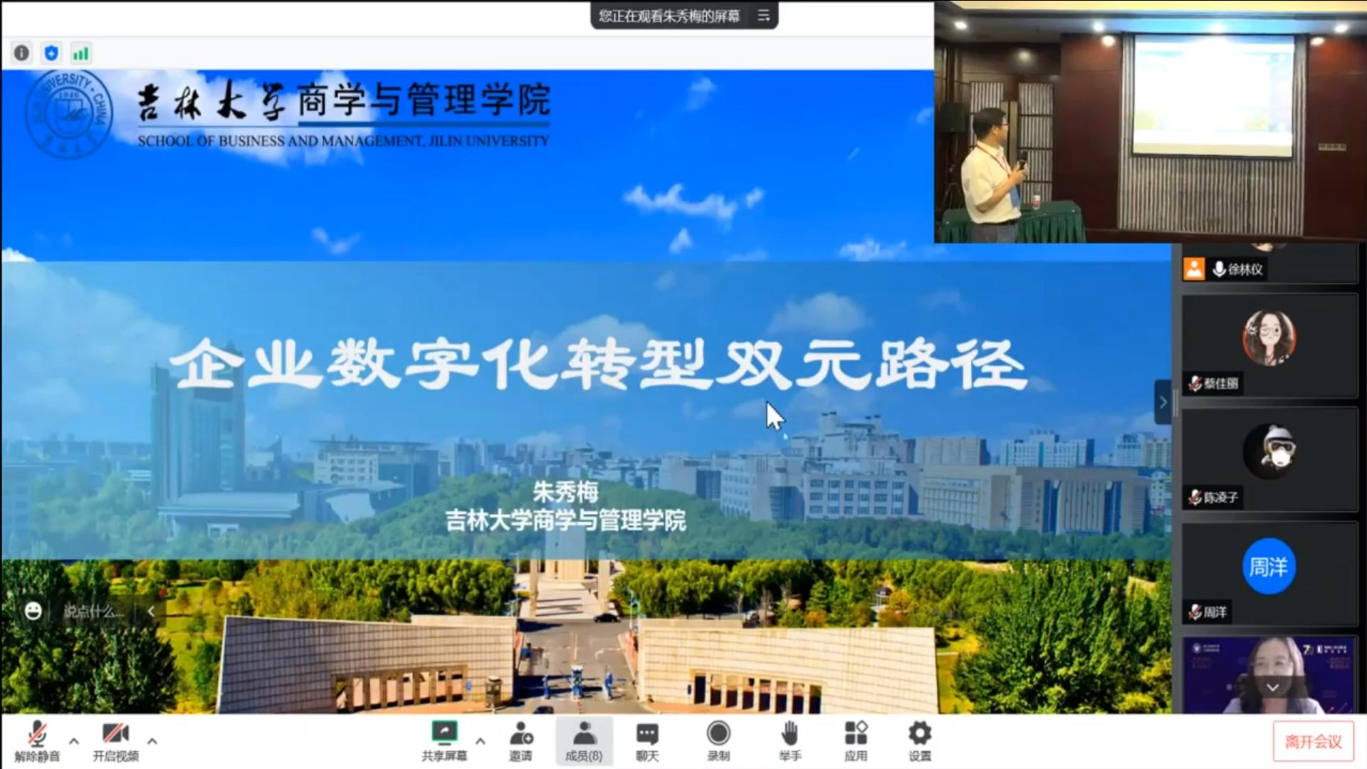 第五位报告嘉宾是吉林大学朱秀梅教授,她分享的主题为“企业数字化转型双元路径”。朱秀梅教授的分享主要包含两个方面:一是企业数字化转型的双元路径,她结合一些具体案例,从利用式数字化转型和探索式数字化转型两个维度进行了翔实的阐释;二是基于实证分析,她探究了数据洞察力对企业双元数字化转型的使能作用。最后,朱秀梅教授提出了有关数字化转型研究的未来展望,她认为数据驱动的企业数字化转型、双元数字化转型的平衡与互补研究以及跨学科研究都是未来不错的研究方向。
