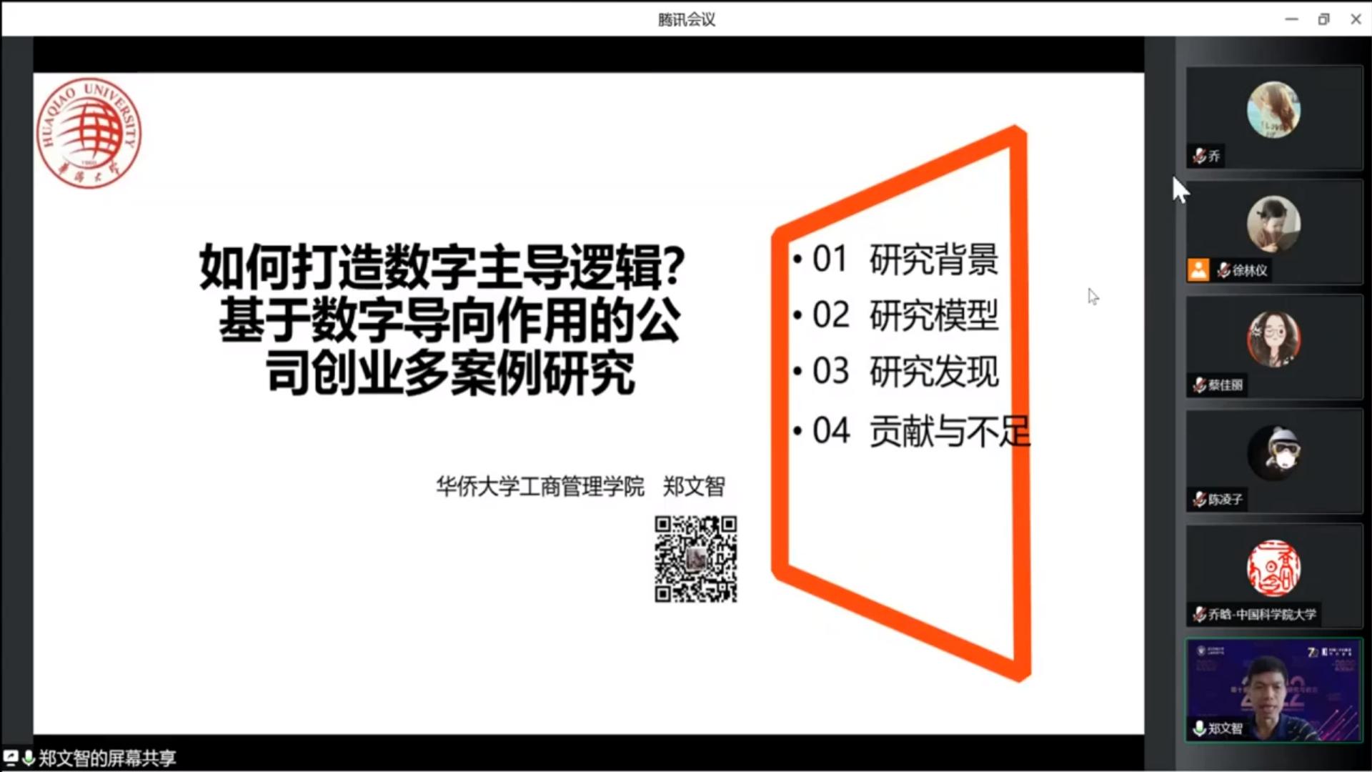 第四位报告嘉宾是华侨大学郑文智教授,他分享的是“如何打造数字主导逻辑?基于数字导向作用的公司创业多案例研究”。郑文智教授基于战略转型理论、主导逻辑理论和数字导向理论提出了自己文章的分析框架,通过研究分析得到了数字主导逻辑形成的过程模型。接着,郑文智教授通过多案例跟踪与观察,分析了数字主导逻辑形成过程中的数字导向作用机理。研究结果显示,在助力数字逻辑的新进入并逐步占据主导地位的过程中,数字导向的作用主要体现在目标整合与方向定位上。