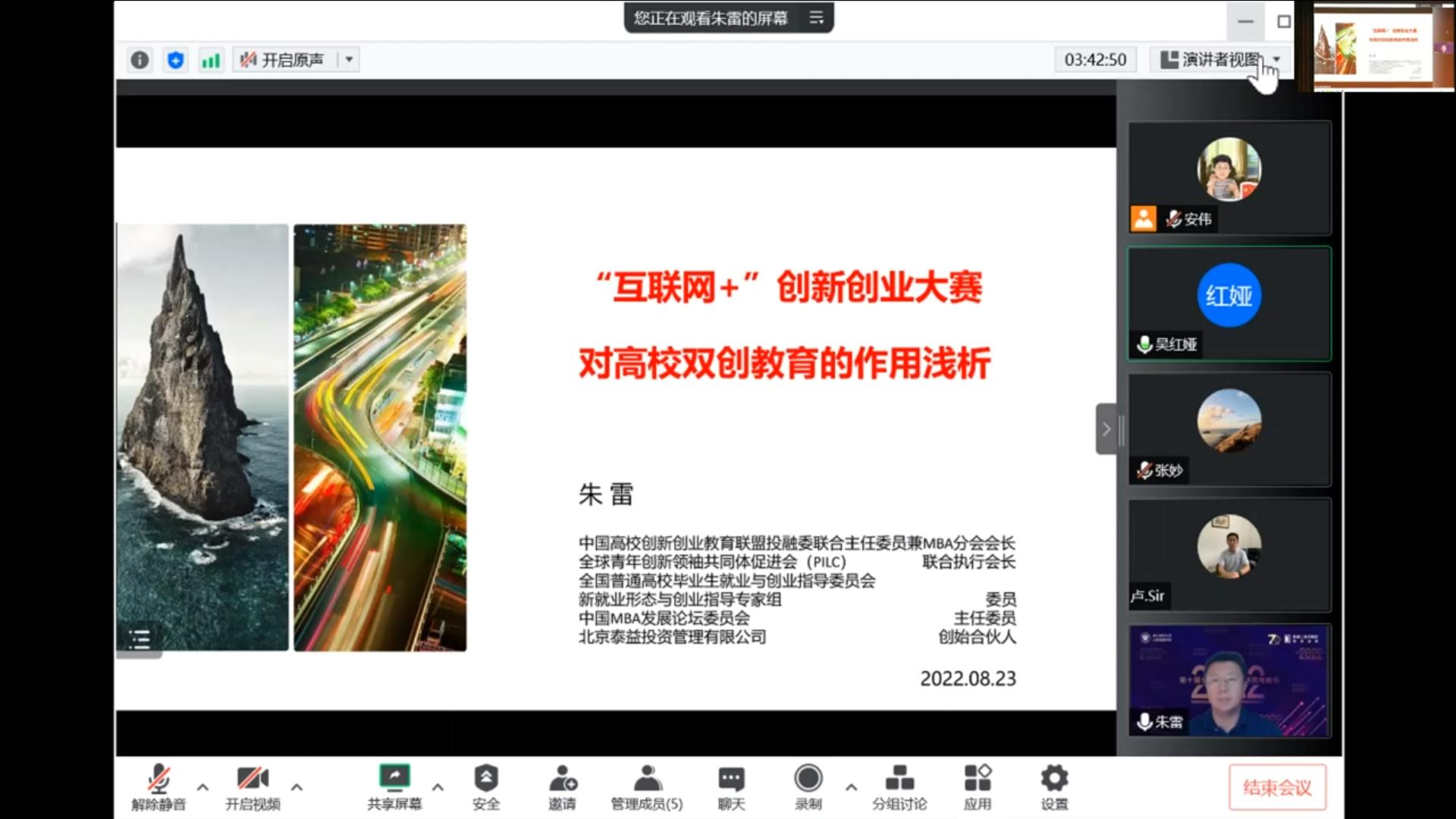 中国MBA发展论坛委员会主任、互联网+大学生创新创业大赛资深评委朱雷老师分享主题是《互联网+创业大赛对高校双创教育的作用》。他认为,创新创业大赛的目的是厚植创新创业土壤、推动高校人才培养模式变革、培养大众创业万众创业创新的生力军;创新创业大赛可以培养年轻人的企业家精神,包括创新、冒险、合作、敬业、学习、执着等优秀精神;创新创业大赛与未来产业结构有密切关系,可能也会影响未来就业趋势。最后,朱老师分别从熵减、进化树、涌现三个角度审视创新创业大赛教育,并分享了自己的看法。