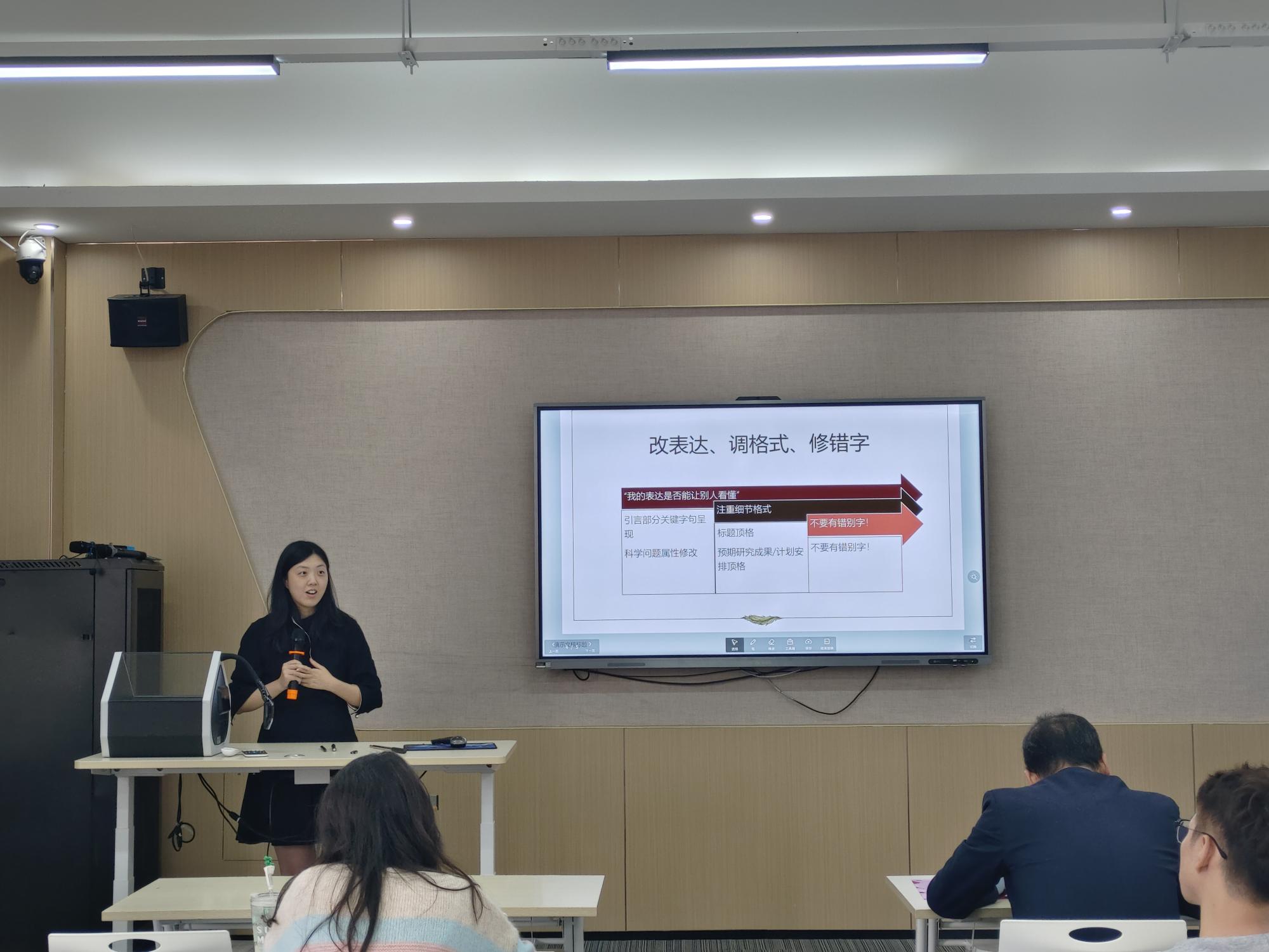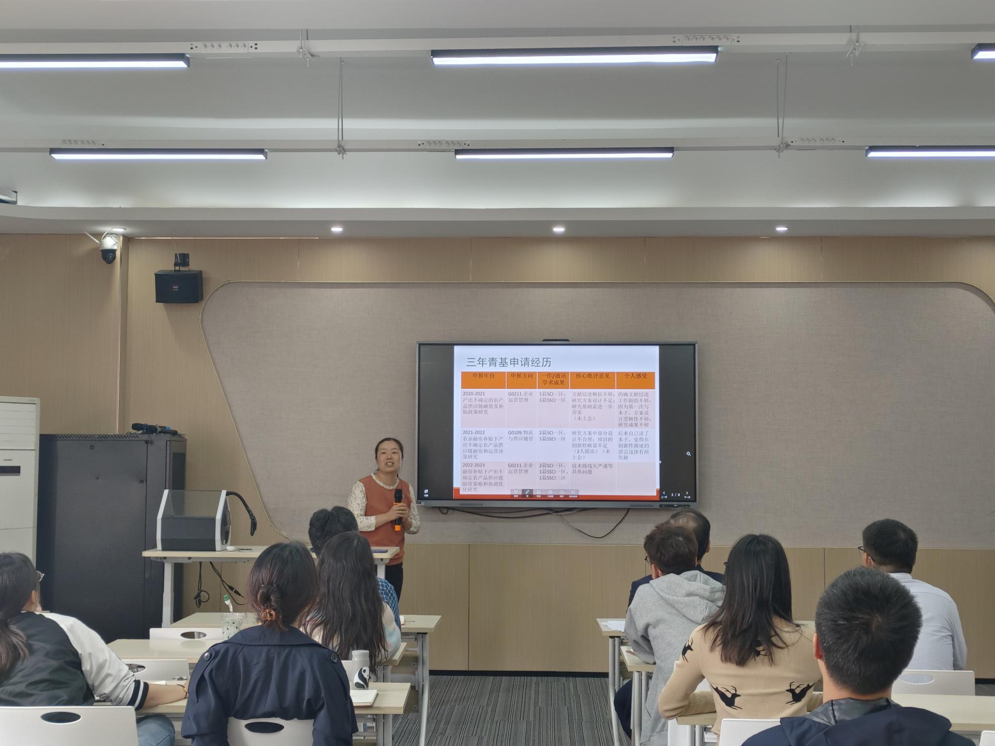 之后,五位老师依次分享自己的申报经验。裴玲玲教授从注意事项、选题方向的把握以及标题的选择与设计方面分享了国家社科项目申报经验,并着重阐述了“跨界+融合”的选题方法。丁雯博士从三年来申报国自科青年项目的经历中,总结了关于选题、研究背景以及文献综述撰写的相关经验,并给出具体可行的建议。邓年奇博士基于申报项目时专家给出的建议进行分享,并详细讲述了自己根据专家建议完善申报书的过程。卢团团博士从选题与定题、提高审美以及学会包装三个方面分享自己申报国家自科项目心得。赵雨菡博士提出申报课题要“胆欲大而心欲小”,既需要大胆破题,也需要细致地梳理逻辑和文字。