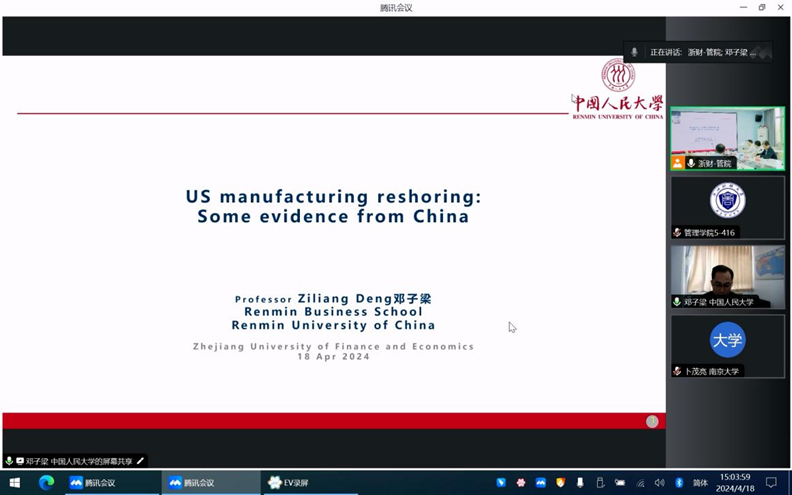 杜健教授四位演讲嘉宾,邀请南京大学商学院张骁教授作为点评嘉宾,以“线下+线上”的方式成功举办“新时期国际商务研究专题研讨会”。副院长戴维奇教授主持会议。