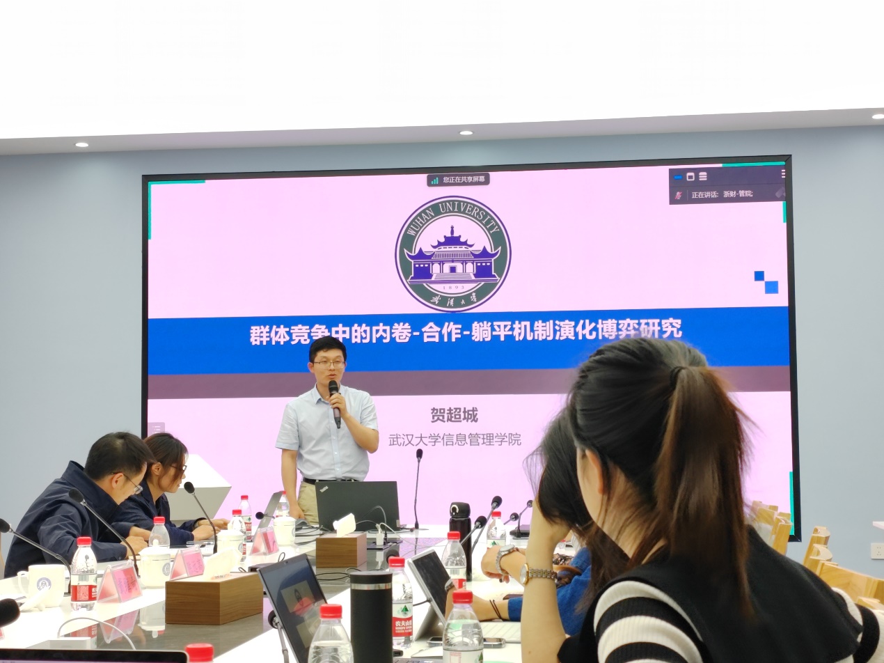 武汉大学贺超城副教授作题为“群体竞争中的内卷-合作-躺平机制演化博弈研究”的学术报告。首先,贺教授从学术层面和网络术语层面介绍了内卷概念和躺平概念,并分别描述了二者的负面影响。贺教授指出,现有的研究往往只关注内卷或躺平其中一个概念,缺乏整体研究的视角,忽略了基于排名的资源分配方法,并且缺乏定量分析的研究内容。随后,贺教授指出现实世界中的社会困境大多数都符合二元博弈的形式,进而介绍在内卷合作躺平游戏的三元策略,进而构造研究中所提到的晶格网络模型,并描述仿真模型中的具体步骤。在此基础上,贺教授分别描述了资源、内卷成本、内卷相对效用,群体能力方差,排名阈值等因素对仿真实验结果的影响。最后,贺教授介绍了研究工作所取得的成效,并总结未来的研究应纳入现实世界的合作和躺平数据,以提高研究的适用性。
