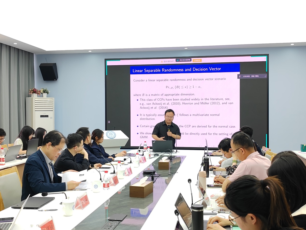 同济大学经济与香蕉视频 胡照林教授以“Chance Constrained Programs with Gaussian Mixture Models”为主题分享相关研究成果。胡教授结合了最近的两篇研究成果,就研究模型和问题方面进行阐述。在研究模型方面,胡教授讲述了机会约束规划模型的背景,以机会约束规划方法为代表,描述了模型的绩效化等方面。随后,胡教授根据不同问题给出了相应的目标函数和约束条件,并详细阐述了各约束、参数的含义。接着,胡教授阐明了联合机会约束规划和单个机会约束相结合的方法,并介绍了水库管理、电网优化等方面的现实问题应用,以及“Gaussian mixture”在机器学习等方向上的理论运用,明确了研究问题方向。最后,胡教授介绍了不同类型的机会约束规划,介绍了梯度简化等方法,并讲述了工作所取得的成效,总结了方法的优势。