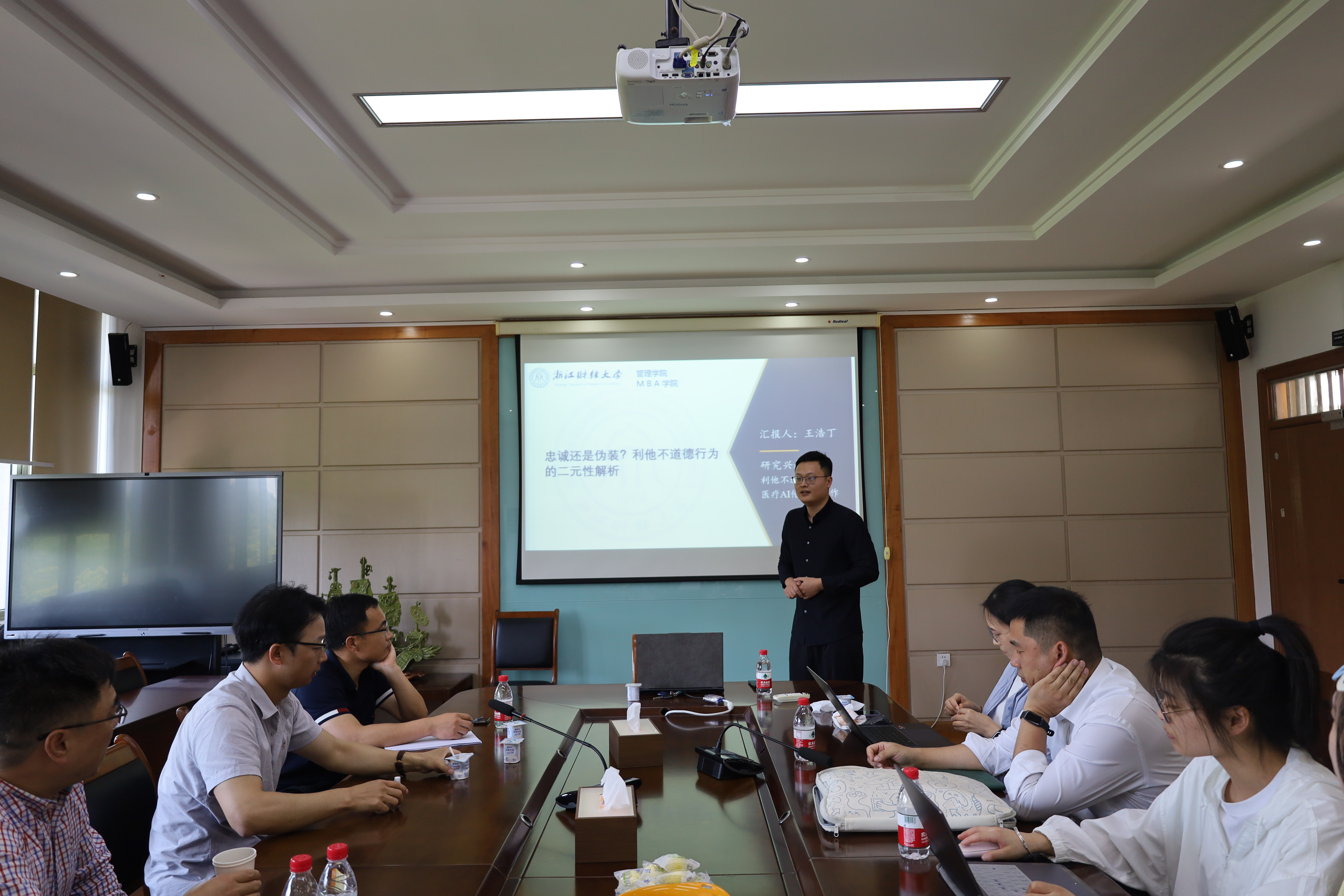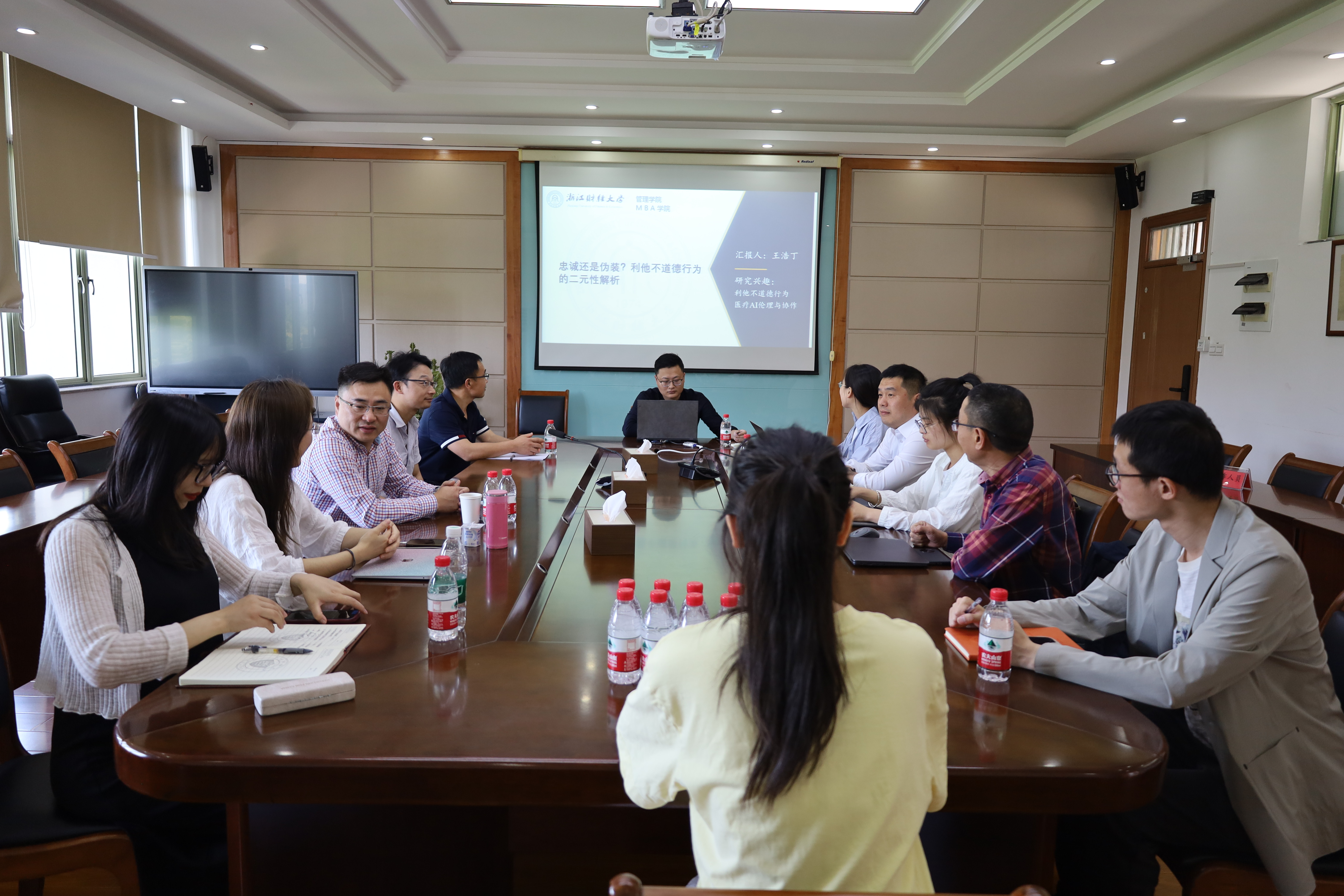 在5-410会议室举办了第四期学术沙龙活动。人力资源管理系老师王浩丁老师作了专题为“忠诚还是伪装?亲社会不道德行为的二元性解析”的学术报告。本次活动由人力资源管理系陈帅老师主持,学术院长马祖军教授与人力资源管理系的各位老师出席了本次活动。