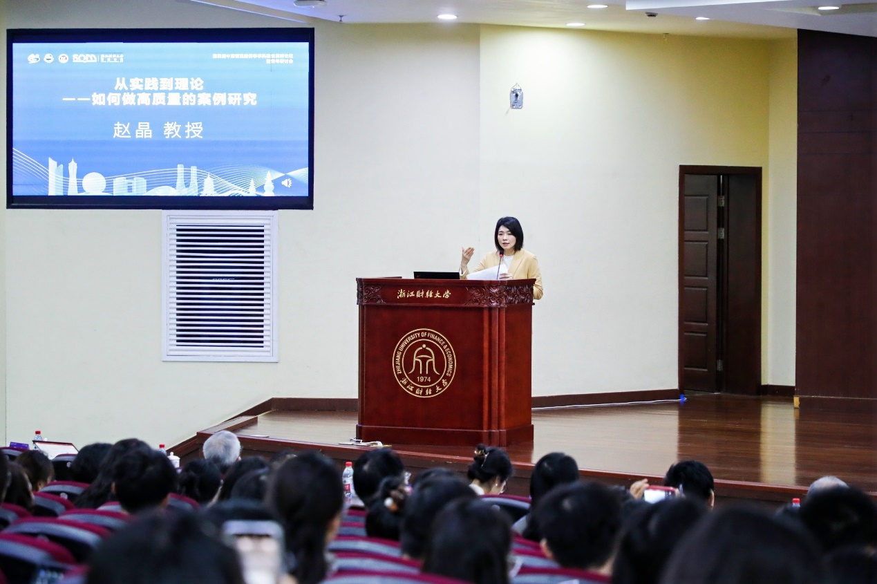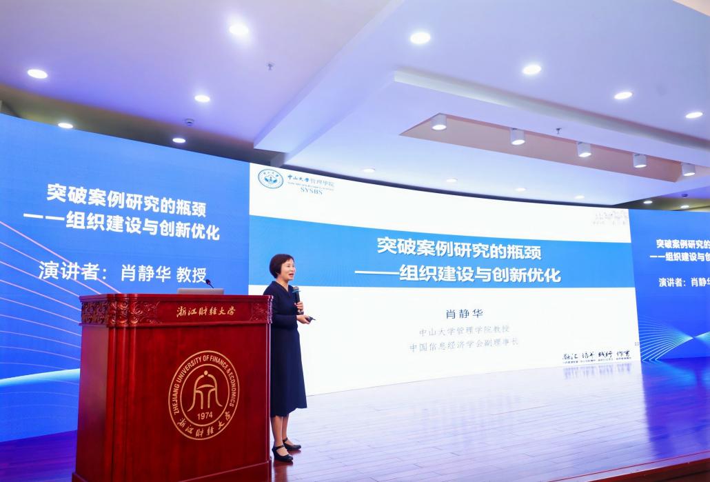 肖静华教授作题为《突破案例研究的瓶颈——组织建设与创新优化》的主题报告。她首先提出高成本、长周期且创新高度不确定是案例研究的主要瓶颈,接着针对这两个瓶颈提出组织建设和创新优化的方法。具体而言,组织建设方面应加强组织设计和机制设计,形成从“用理论”到“拓理论”、再到“创理论”的过程;创新优化方面要创新解构化和跨界常态化。肖静华教授指出数字技术的快速发展和商业模式的快速变化,开启了探索的实验场,创造了大量的研究机会,但真正的原创理论需要漫长的实践积累和知识沉。