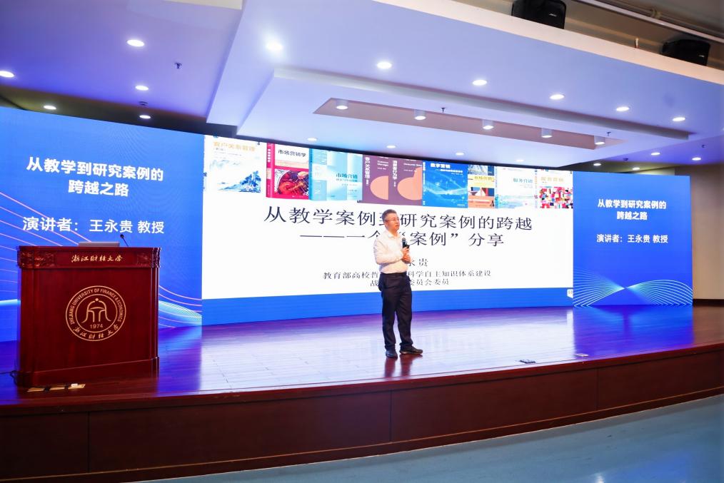 浙江工商大学校长王永贵教授作题为《从教学到研究案例的跨越之路》的主题报告。王永贵教授指出,案例研究作为探索实践智慧的方法,有力地引发了理论界与实践界的思想共鸣与共振,推进了管理教学与科研面向实践的转型。接着,他阐述了教学案例和研究案例的区别,指出实现从教学案例到研究案例的跨越以及实现“讲台”与“研究”的共赢对青年教师尤其重要。王永贵教授以施耐德电气数字化转型为例,讲述了从教学案例跨越到研究案例的应用实例。他指出案例有助于贯通产学研用。