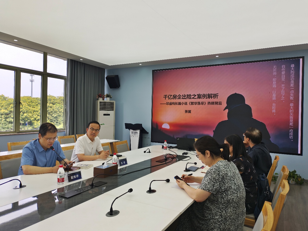 416会议室成功举办。本次讲座邀请了知名财经作家、浙江连天美企业管理有限公司董事、副总裁张翼,以“千亿房产出险之案例解析——非虚构长篇小说《繁华落尽》热销背后”为题,向在场师生做了系统分享。论坛由戴维奇院长主持。