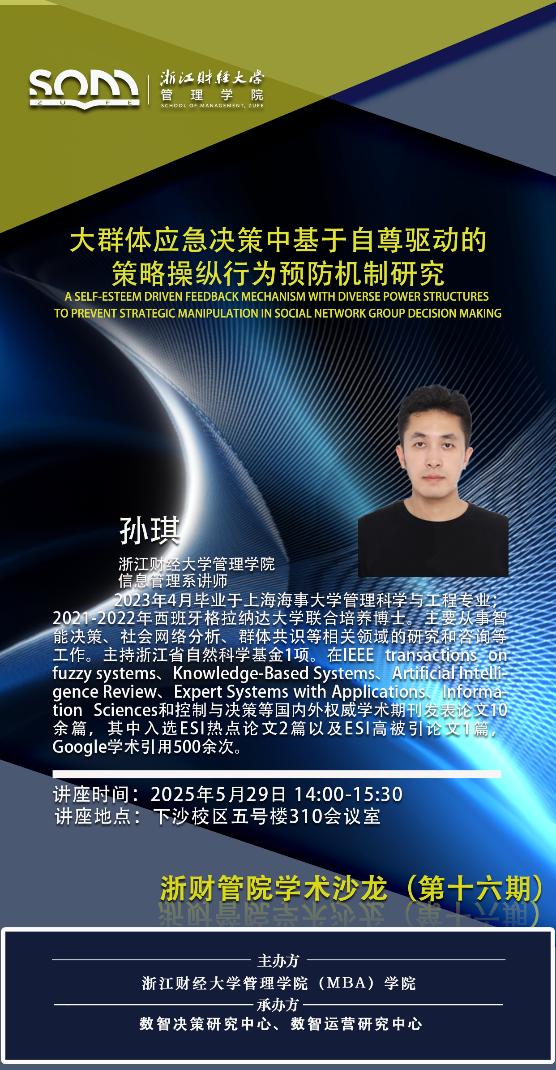 5月29日下午,数智决策研究中心的孙琪老师应邀参加学术沙龙第十六期并分享最新研究成果。他分享的主题为“A self-esteem driven feedback mechanism with diverse power structures to prevent strategic manipulation in social network group decision making”。沙龙由彭娟娟老师主持。