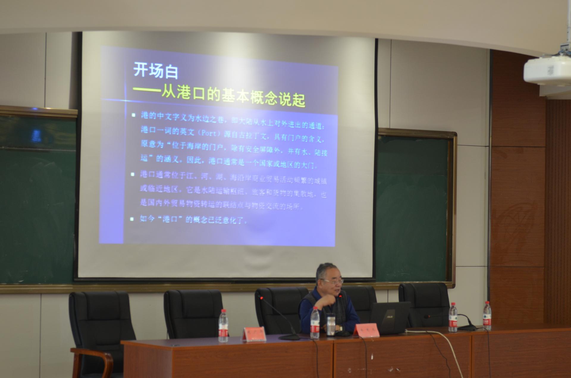 林国龙教授首先从港口的基本概念说起,讲解了港口的基本功能及辐射能力,深入浅出的解读了港口经济的发展历程及其特点,随后从临港产业发展的角度进一步阐释了港口物流理念的兴起以及港口—物流—城市的相互关系;接着剖析了我国物流的十二大商业模式分析,指出物流发展的四大前沿问题;同时,针对互联网+大物流的发展形态下的带来核心价值和理念的重大转变进行了深入分析;此外,对政府和企业在发展港口物流中的作为分别做了详细讲解;最后,针对学生关注的市场对物流服务人才的需要,林教授从能力知识体系与架构角度进行了分析。