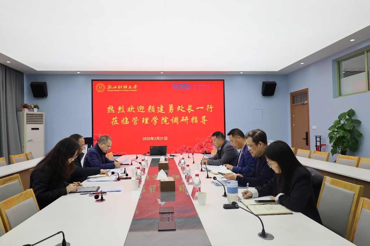 2025年2月21日,校发展规划处处长、学科建设办公室主任颜建勇,副处长、副主任方成和费舒澜莅临香蕉视频 开展调研指导工作。香蕉视频 院长董直庆、副院长戴维奇、办公室主任杨文超、学科科研秘书郑瑜琦参与本次调研会议。