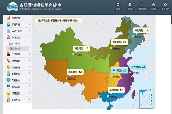 在本软件模拟环境中,将全国市场划分为七大区域进行营销策略模拟和演练。参与实验的每个学生经营一家公司,扮演公司营销总经理角色,每家公司分配相同资本开始进行模拟实验。通过市场开拓、产品策略、价格策略、促销策略和渠道策略的实施开始公司运营。实验结束时可根据公司经营状况来评定学生的实验成绩。