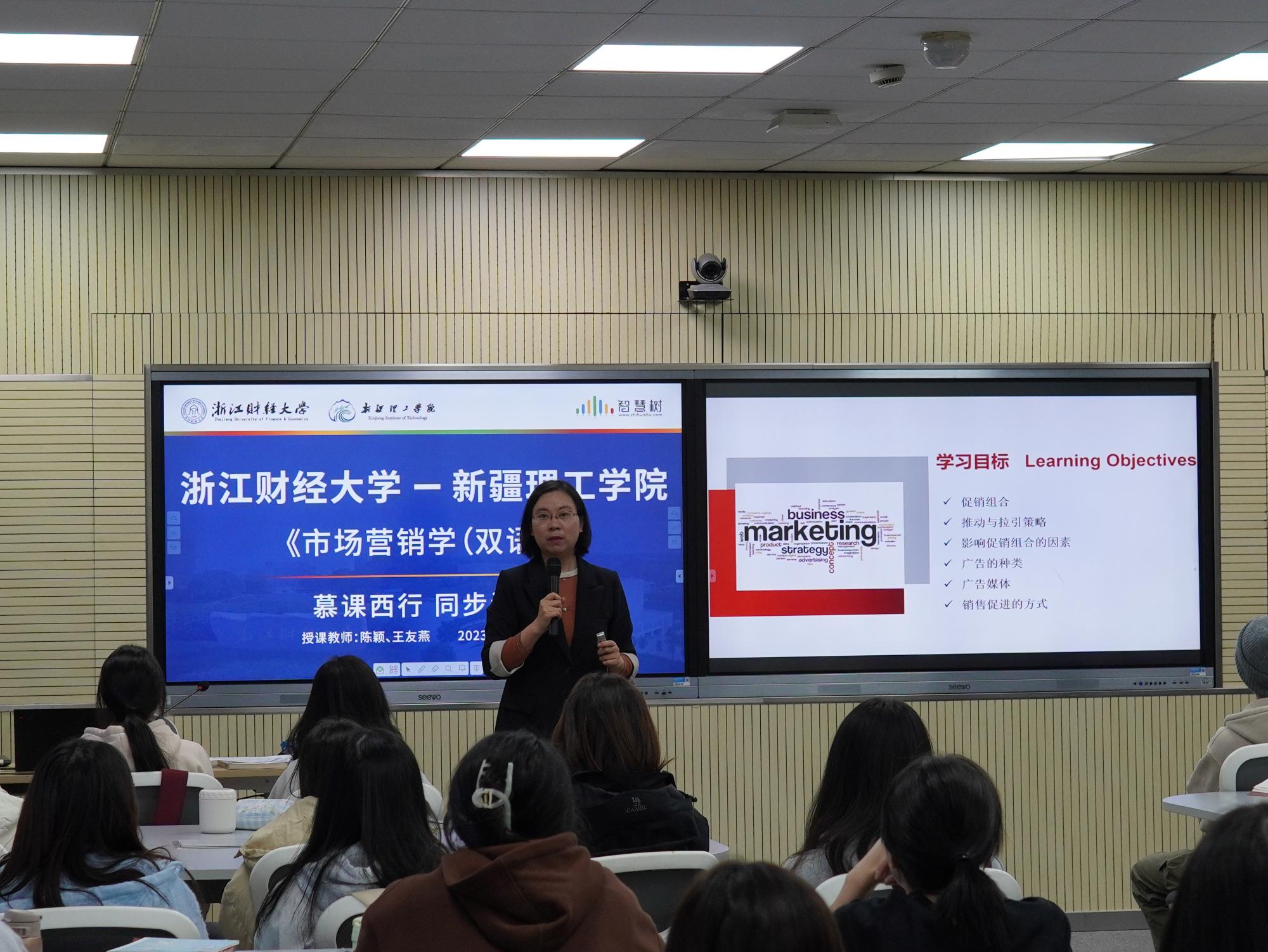 工商管理教学团队教学论坛”“跨越山海共研修——营销研课坊”,开启柔性援疆的教育精准模式,助力新疆理工学院打造一批带不走、留得住的本地“金课”“金师”“金专”。此外,陈颖老师每学期奔赴4700公里以外的新疆理工学院亲自为学生线下授课一周,让学生近距离感受知识共创的市场营销学(双语)课堂,辅导学生参加新疆维吾尔自治区大学生乡村振兴创意大赛取得五项金奖,为新疆理工学院培养“金生”贡献浙财力量。
