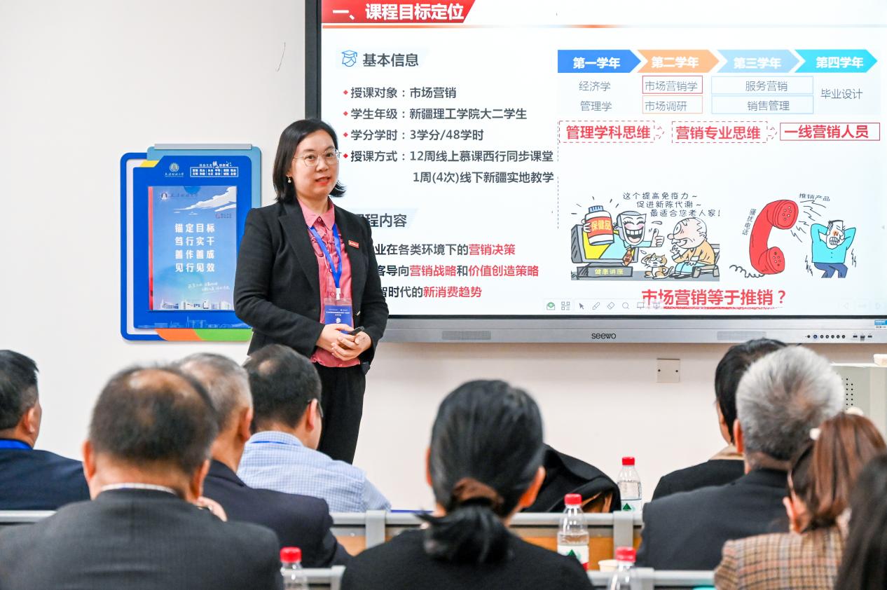 陈颖老师以“慕课西行,金课援疆”为抓手,结合《市场营销》导研、导练、导思的课程特点,从课程定位、学情分析、范式改革、创新举措、评价考核和创新成效等六个方面,详细深入地汇报了在新文科背景下,课程依托“数智赋能”,坚持三年时间为新疆理工学院市场营销学生每周线上授课,每年远赴4300公里线下授课,指导新疆学生荣获省级大学生乡村振兴大赛金奖5项,为新疆理工学院培养青年骨干教师4名,为全国高等教育组团式援疆贡献“柔性援疆”的香蕉视频 方案。在后续的现场教学环节,陈颖老师以“市场营销观念的演化”这一核心知识点教学节段为例,生动呈现了新疆学生从棉纺产品的文创设计入手,不仅传递大美新疆好风光,也时刻关注新疆乡村扶贫的民生温度,再到柯柯牙绿色精神的再创意,最终形成并深度实践“文化润疆”的营销观念,将理论讲解与实践应用融会贯通,获得现场评委一致肯定与好评。