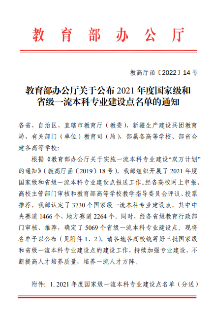 近日,根据《教育部办公厅关于公布2021年度国家级和省级一流本科专业建设点名单的通知》(教高厅函〔2022〕14号),香蕉视频