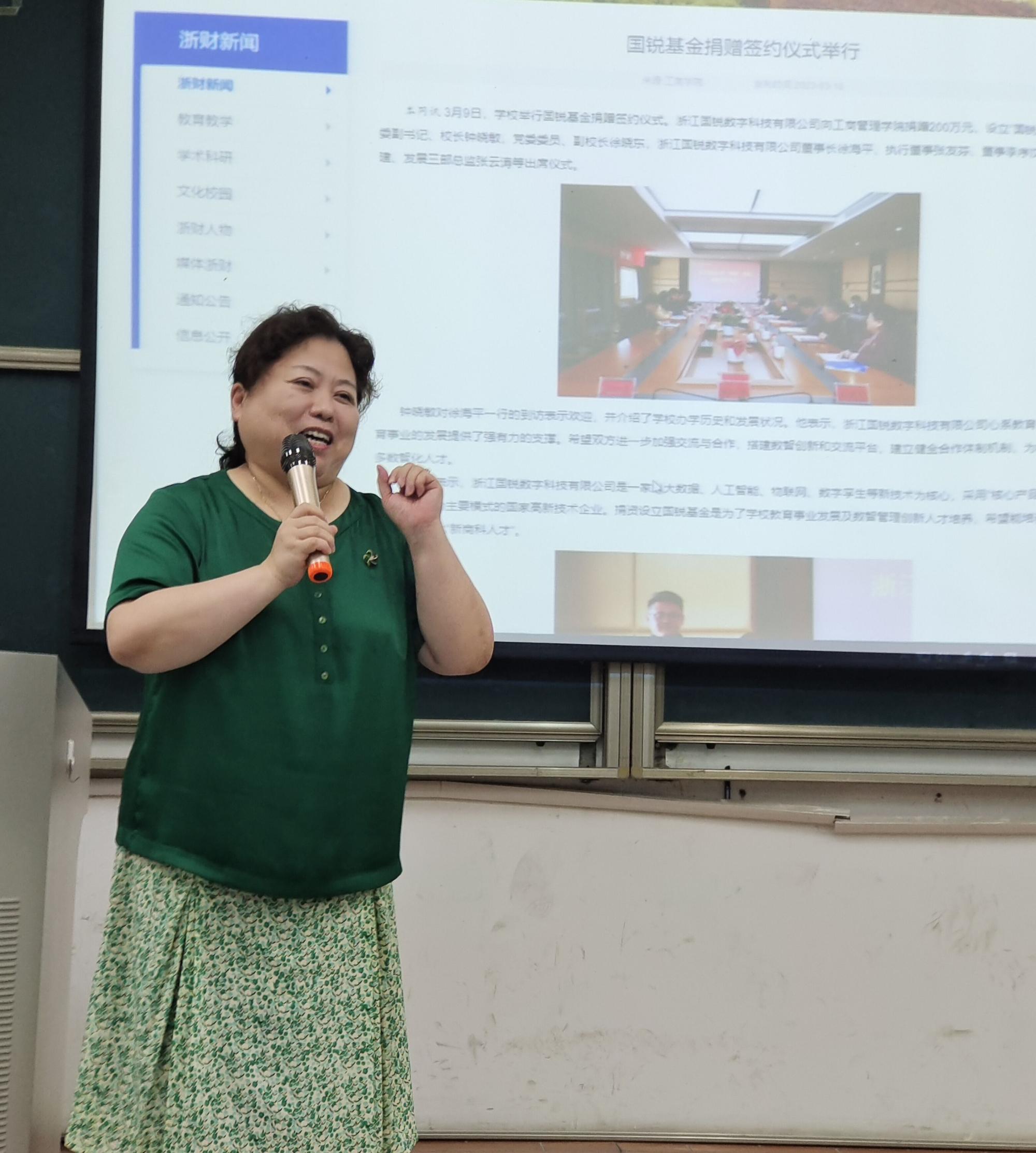 沈渊老师从新财经人才培养出发,详细介绍了浙江国锐数字科技有限公司的支持、数智管理创新班的各项优势及培养方案、数说育人成果、未来的发展前景以及数智管理创新班的选拔机制等作了《数智管理 赋能未来》主题发言,并详细解答同学们关于报名流程、笔试、面试等相关问题。