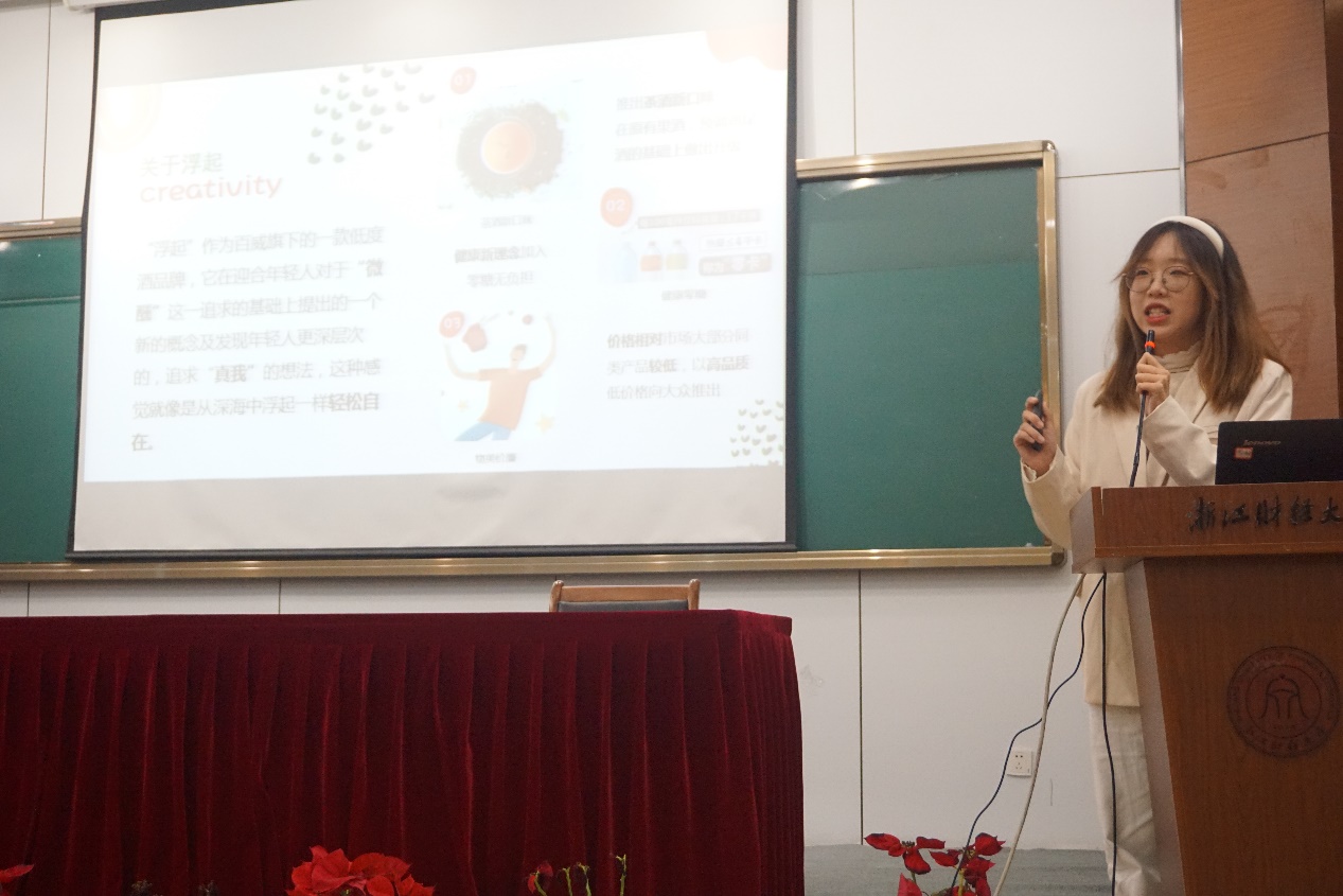 经过三个半小时的激烈角逐,本次比赛共评选出三等奖项目三个,分别是:七月剧本杀策划团队,成员有杨晶晶、吴小康、吴森楠、沈依凡;久诚新团队林佳乐、李天柔,林晓涵,林骏皓和西溪十里芳菲沉浸式剧本杀策划团队王莹、周汪希、杨院光、胡颖超;二等奖项目两个,分别是:Pepsi in ZUFE策划团队,组长是曹颖和队员朱枫颜、毛昕奕、卢安欣;以及英国女王都在用的特百惠策划团队,组长潘亚男和队员应方羽、周卓尔、毛若倩。一等奖项目一个,由乐高进军老人市场策划团队范鑫茹和田娜娜获得。英国女王都在用的特百惠策划团队的主讲人,来自19会计1班的潘亚男同学和低度酒新体验“百威浮起”策划项目团队的主讲人,来自20工商3班的汪明凯同学获得了现场最佳陈述奖。