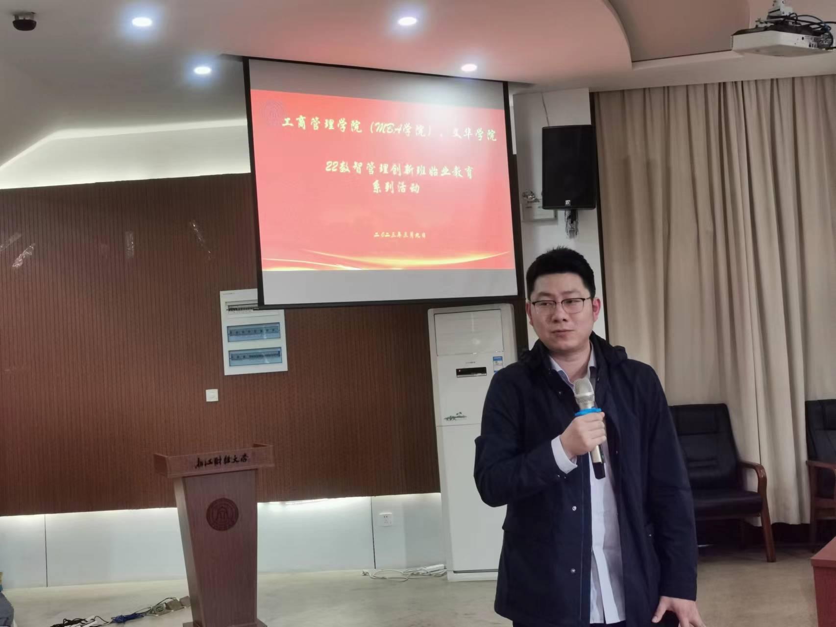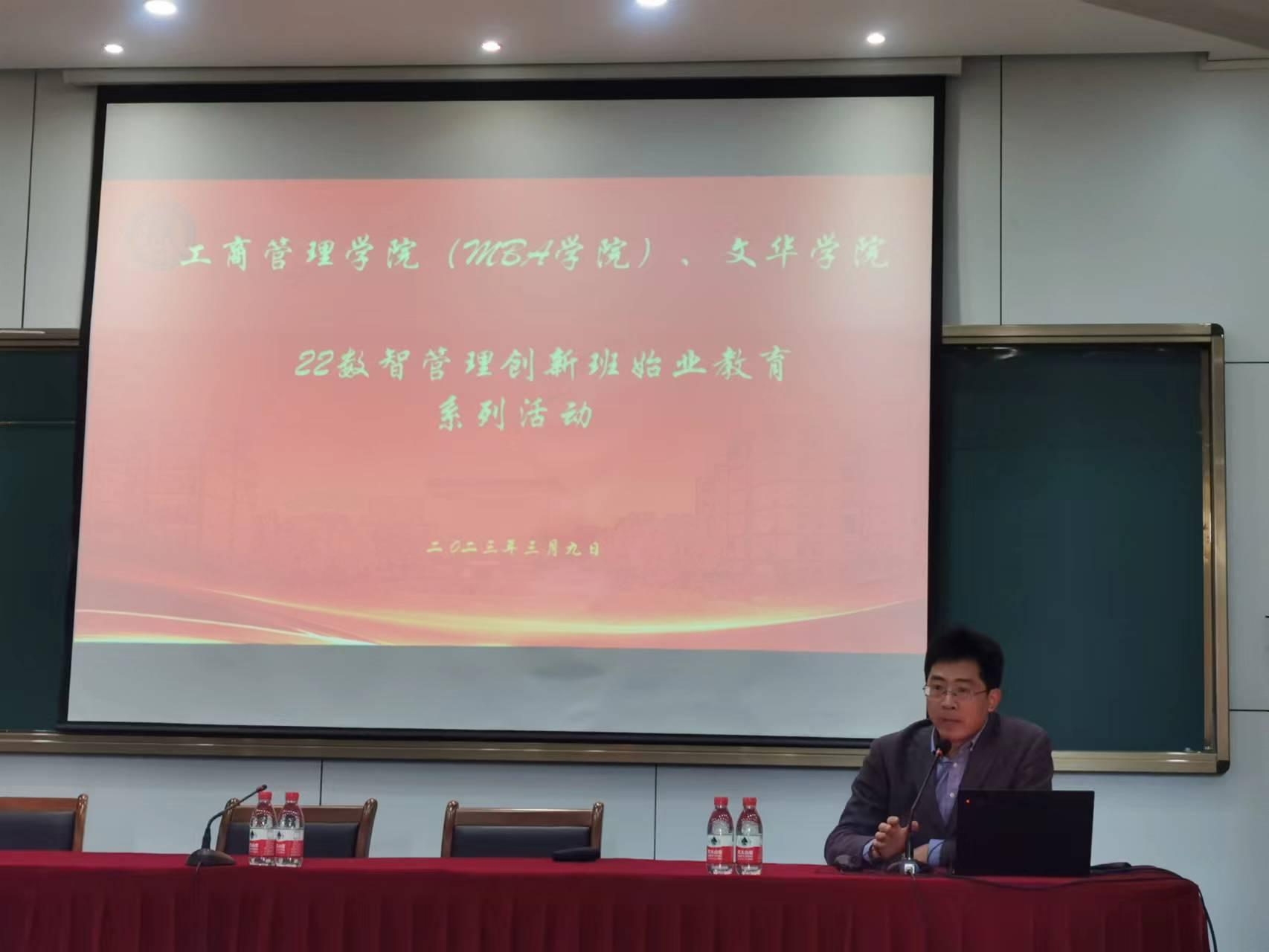 首先,工商学院院长王建明介绍了创新班具有的丰厚师资和社会资源;王院长还以此为切入点提出了“填表理论”,希望创新班学子将填表意识深深印在心里,从个人信息出发,用理论课程、实践经验、学科竞赛等内容不断将空白的表格填满;王院长向学生们传授了“一鱼多吃”的竞赛理念,号召同学们积极参与学科竞赛,锻炼实践能力、提高数智化管理水平。王院长向同学们强调了要发挥主观能动性,主动和导师联系,“一寸光阴一寸金”,要珍惜大学生活。