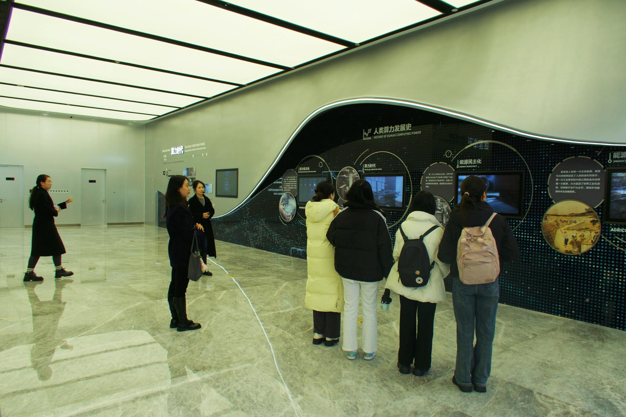 首先,同学们来到了算力小镇的算力创新馆。这里展示了前沿的大数据和芯片技术,让大家感受到数字经济的强大力量。走进算力小镇创新馆,三折幕数字沙盘空间映入眼帘,极具科技感地展示了整个算力小镇。在工作人员的带领下,老师们怀着一颗好奇与求知的心,认真聆听工作人员耐心而专业的讲解,仔细观看展厅里的动画、视频,了解了从农耕时代刀耕火种到现在人工智能、大数据、5G等技术的崛起,人类社会的算力的历史演变和算力工具的迭变。