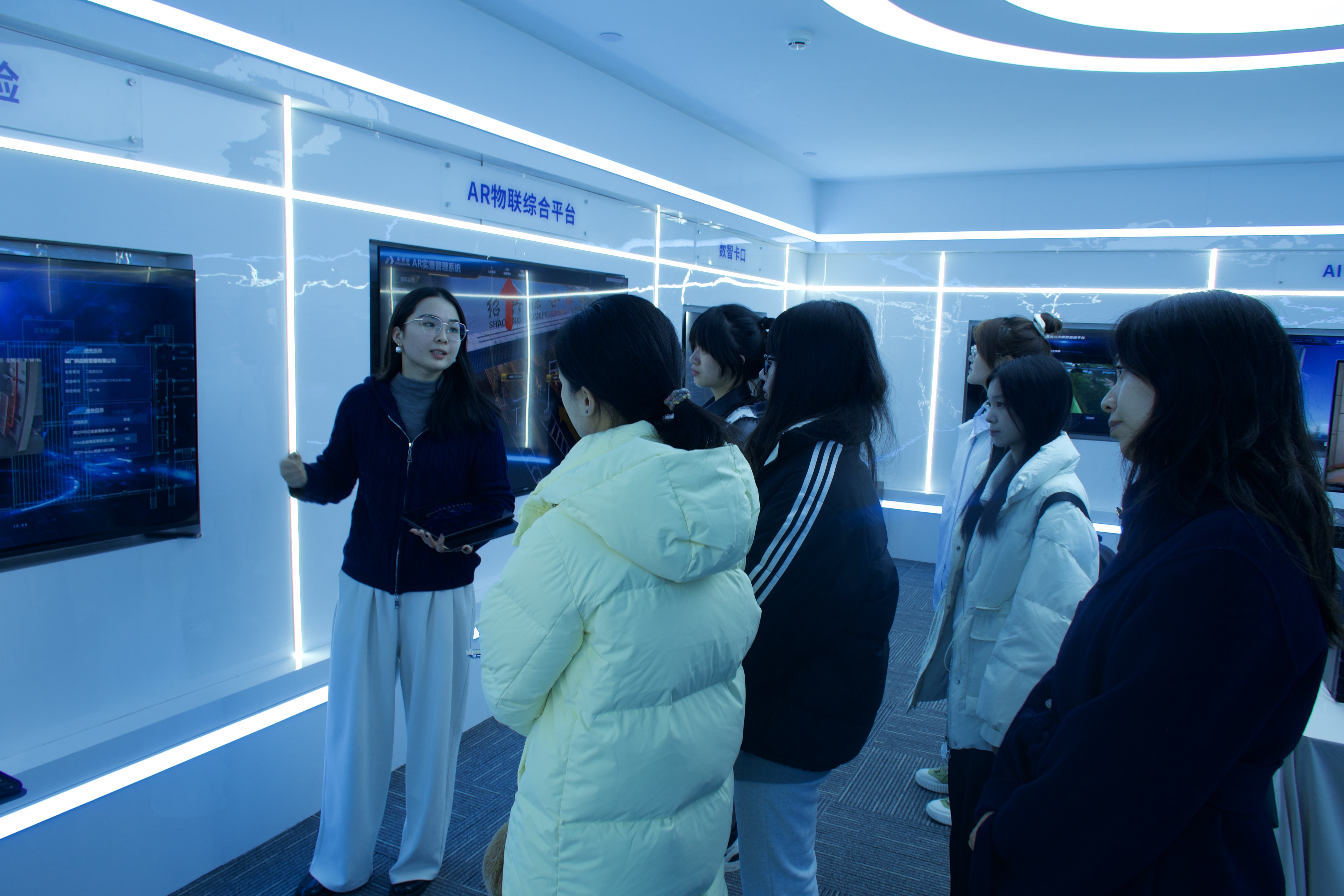 第二站,我们来到了业界领先的AI中台产品与服务供应商——数聚链。数聚链积极发展优质生产力标杆场景,面向全国市场的“人工智能+、绿色科技赋能智慧口岸、物流枢纽、低空经济等领域。同时,其更是对数据要素价值的深度挖掘和应用,积极探索实践建立数据资产化的“铁三角”: 数据生产、精准评估与资产化、数据运营中的长期保值增值,以及数字孪生技术在数据资产化中的应用。在展厅中,负责人介绍了数聚链AI技术、大数据、产品研发创新情况及未来规划,公司正积极发展优质生产力标杆场景,面向全国市场的“人工智能+、绿色科技赋能智慧口岸、物流枢纽、低空经济等领域。这无疑开展了同学们的眼界,对未来市场营销学习与人工智能结合有着丰富的启示