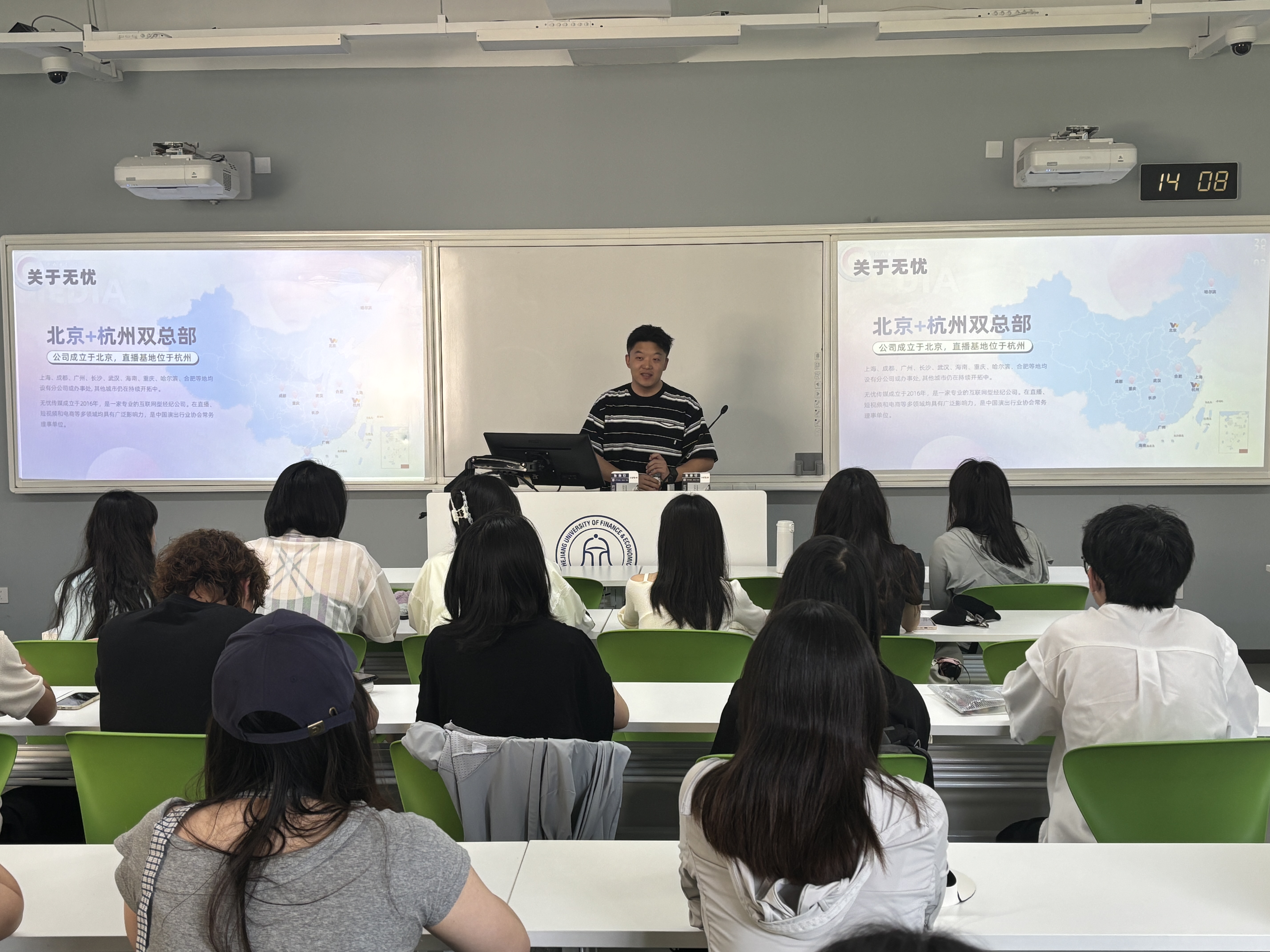 市场营销系副教授李晓锦老师、无忧传媒人才与文化发展总监郝凯以及整个无忧传媒人才与文化发展部门。本次活动为同学们带来了一场关于新媒体行业深度剖析与实战技巧的知识盛宴,并现场开启了激动人心的KOC招募,为心怀梦想的年轻创作者们铺设了从理论学习到实践应用的坚实桥梁!
