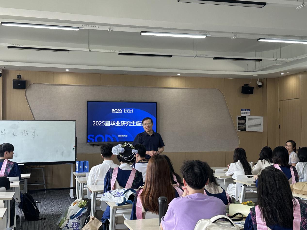 2025届硕士研究生毕业欢送会在学院楼411教室顺利举行。学院副院长戴维奇、研究生教学秘书徐璐、研究生辅导员沈晓云,以及全体毕业研究生欢聚一堂,共同见证这一难忘时刻。