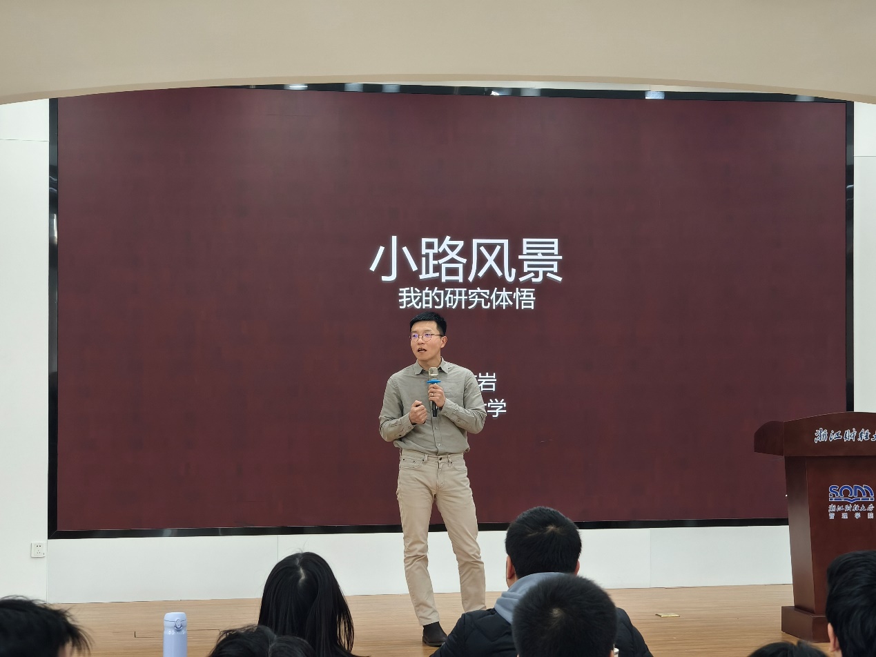 随后,吴志岩教授以个人科研历程为主线,结合丰富的研究案例与真切体悟,与在场师生回顾了自博士毕业以来所经历的“荆棘”与“风景”。他重点分享了在国外访学期间,通过参与导师项目,系统掌握了研究选题、研究设计的经历,以及最终在UTD等国际顶级期刊上发表多篇论文的精彩过往。他鼓励研究生在科研道路上坚持以学习为导向,既要脚踏实地、专注积累,也要拓展视野、广泛汲取,为未来的学术创新与突破做好充分准备。