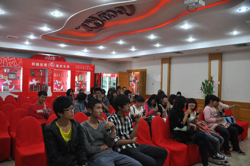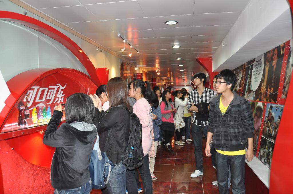 离开了顶益公司,参观团队步行来到了杭州中萃食品有限公司,首先映入眼帘的就是红色的“coca-cola”标志,接着又看到很多可口可乐的相关个性展品。在会议室,同学们看到了可口可乐特有的“概念货车”展架,里面摆放着各式的可乐瓶,个个精美绝伦。在了解了可口可乐公司之后,参观团队又在公司专业人员的引领与解说下,参观了两个全自动的流水线生产车间,参观成员还和技术人员进行了热情答问交流,营造了良好的学习氛围。直到下午4点半,整个参观活动接近尾声,参观团向工作人员表示了感谢并且留念。