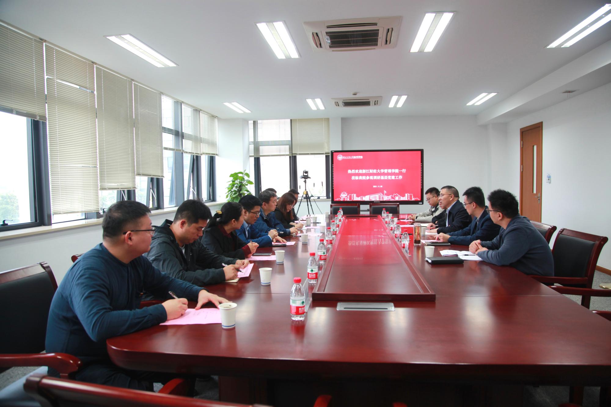参观结束后,双方开展了基础党建调研座谈会。杭州商学院党委书记古家军对学院一行的到访表示热烈欢迎,随后他介绍了杭州商学院党建的基本情况、教师构成、办学特色和学院党组织的构成,并分享了党建的三个平台、五大机制和三个层面的融合。