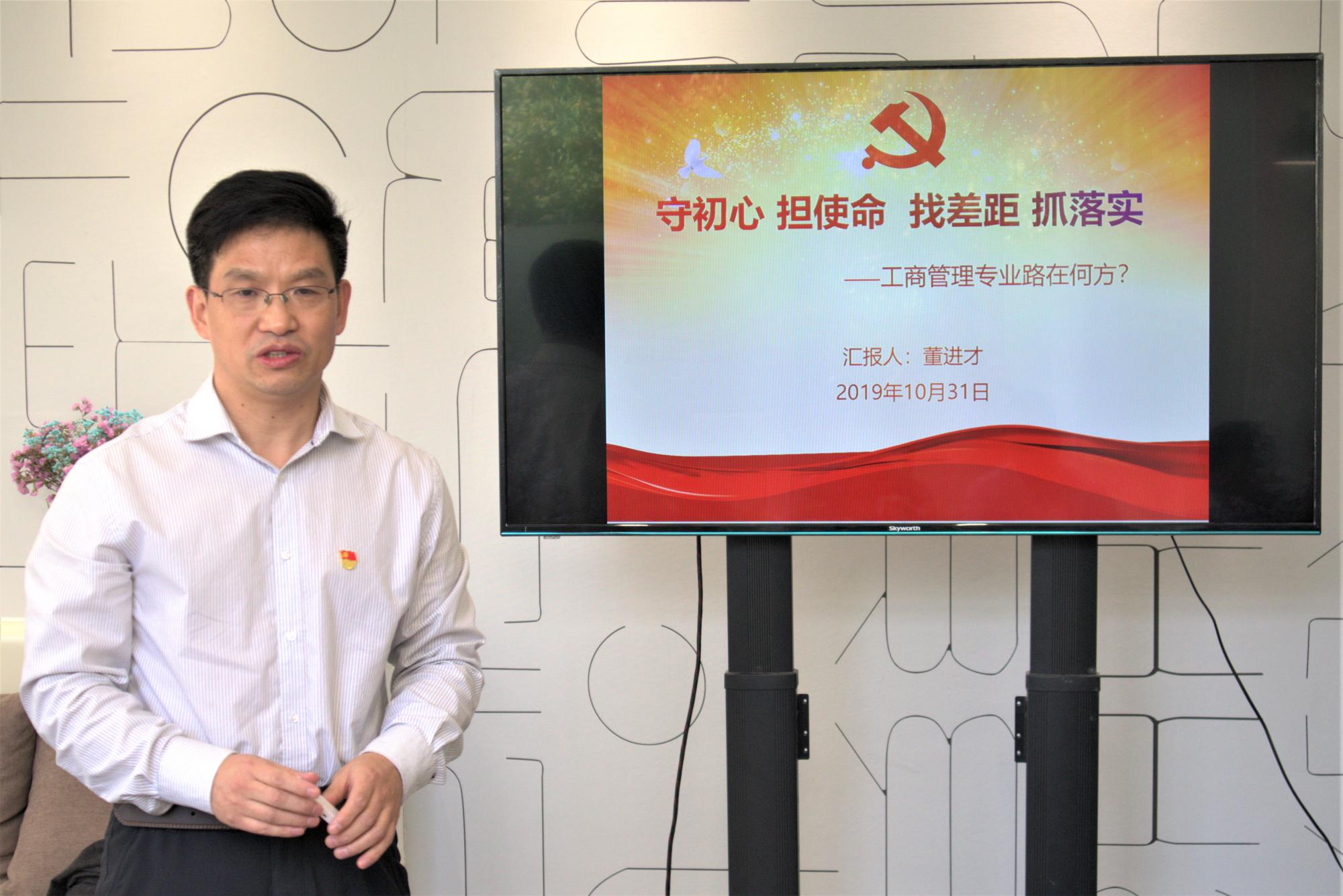 10月31日,工商学院院长、党委副书记董进才在工商学院楼“双带头人”教师党支部书记工作室以“守初心、担使命、找差距、抓落实——工商管理专业路在何方”为题,结合学院近期检视问题,整改落实工作情况,为联系支部作“不忘初心、牢记使命”主题教育专题党课。学校“不忘初心、牢记使命”主题教育第一联络组组长沈水法、组员田聪出席本次党课。