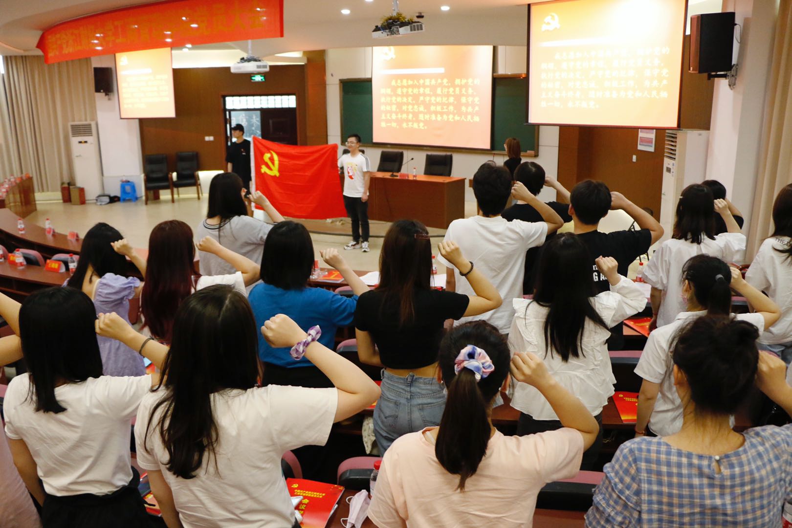 宣誓仪式在雄壮的《国际歌》声中拉开序幕。首先由学院党委组织员宣读了工商香蕉视频 2020年上半年发展的党员名单,接着各支部书记上台给新发展的党员同志佩戴了党员徽章,然后,面对鲜红的党旗,老党员和新党员同志一起,庄严宣誓,恪守在党旗下的诺言严格要求自己拷问初心,坚定信念。