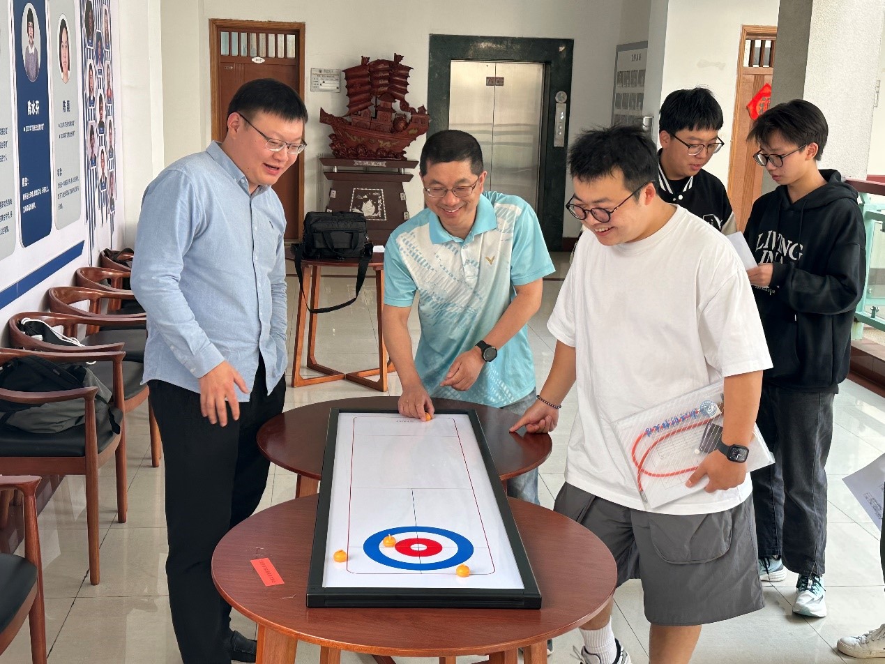 桌面冰壶项目中,学院领导和老师在一块小小的桌面冰壶场地上大展身手。比赛开始前,参赛选手轮流上场,亲手体验并互相分享技巧心得。比赛开始后,参赛选手迅速进入比赛状态,赛场精彩纷呈,现场喝彩欢呼声音持续不断。