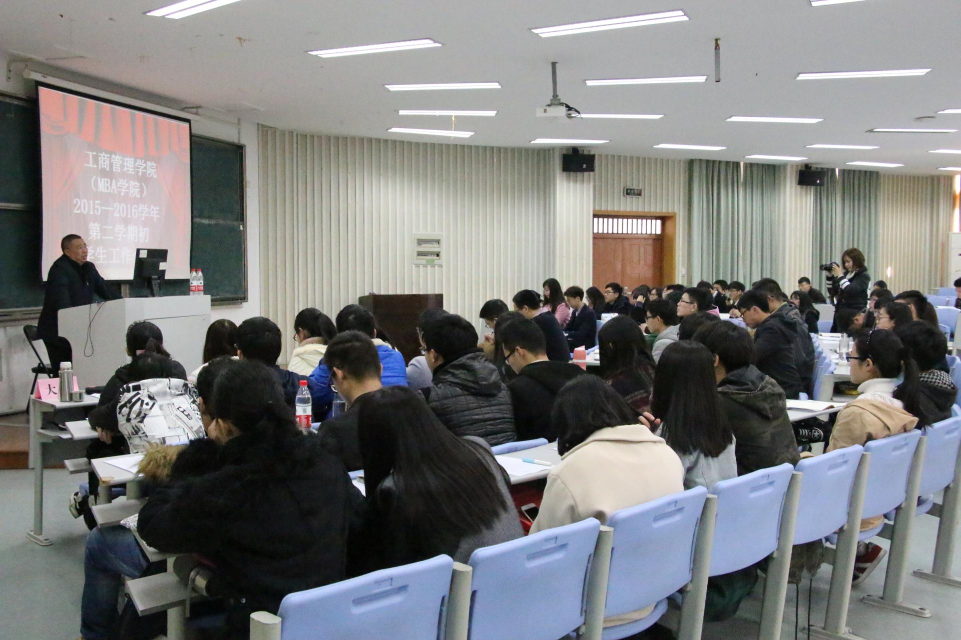 院长董进才老师先介绍了新工商香蕉视频 (MBA学院)基本情况,指出新工商香蕉视频 (MBA学院)是由原工商香蕉视频 和MBA学院组合而成,提出学院新发展愿景。着重强调了学院核心工作是学生培养,因此他希望老师与同学们多沟通,建立起良好的关系。对于学院建设,他认为应积极响应创新创业的号召,主张将学生工作与学科建设、专业建设结合在一起,以能力培养为核心构建学生活动,鼓励同学们在学科竞赛上投入更多精力,从竞赛中提升自己。他还指出学院人才将做分类培养,针对考研方向、就业方向采取不同的人才培养方案。此外他再次强调了学风建设方面的“三无两高”课堂,指出树立良好的学风是关键,学生干部应当做好表率,塑造良好的学习氛围。