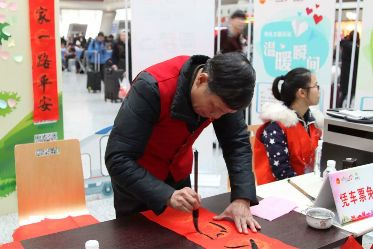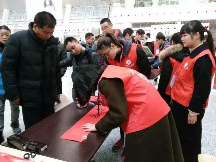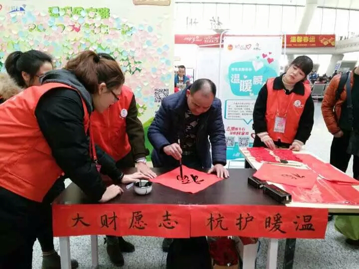此外,为了给冬日里回家的乘客增添一份温暖,校党委宣传部何建中老师和“红马甲们”还在现场手持毛笔,为旅客们写春联送祝福,有旅客拿到赠送的“福”字时忙碌的神情立刻舒展开了笑脸,并表示回到家后马上贴起来。还有旅客们自己动手写春联,希望用自己的心意书写新一年幸福安康的期盼。