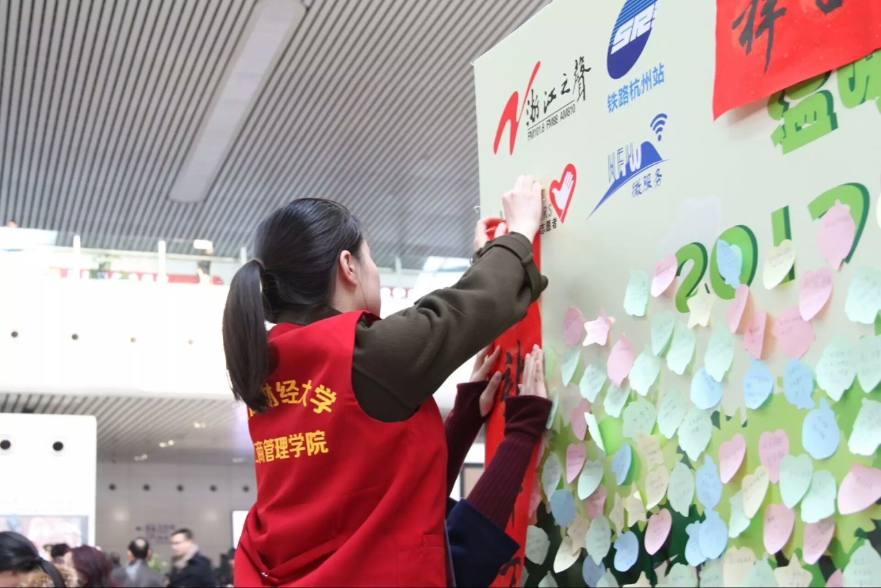 的志愿者们。为了更好地服务旅客,保障春运,50余名志愿者经过有序的组织,在14、15日,开展了“暖心护杭·志愿财大”文明出行倡议志愿活动,用爱心为杭城增添温暖。我们的志愿还获得了领导和外媒的肯定,团中央青年志愿者工作部副部长黄英锋视察青年志愿者工作,与我们青志同学们亲切交谈,鼓励大家用服务诠释青春,行动践行梦想。