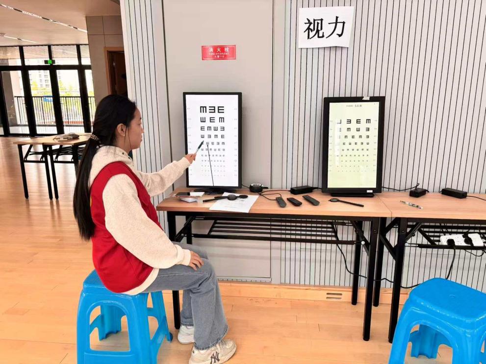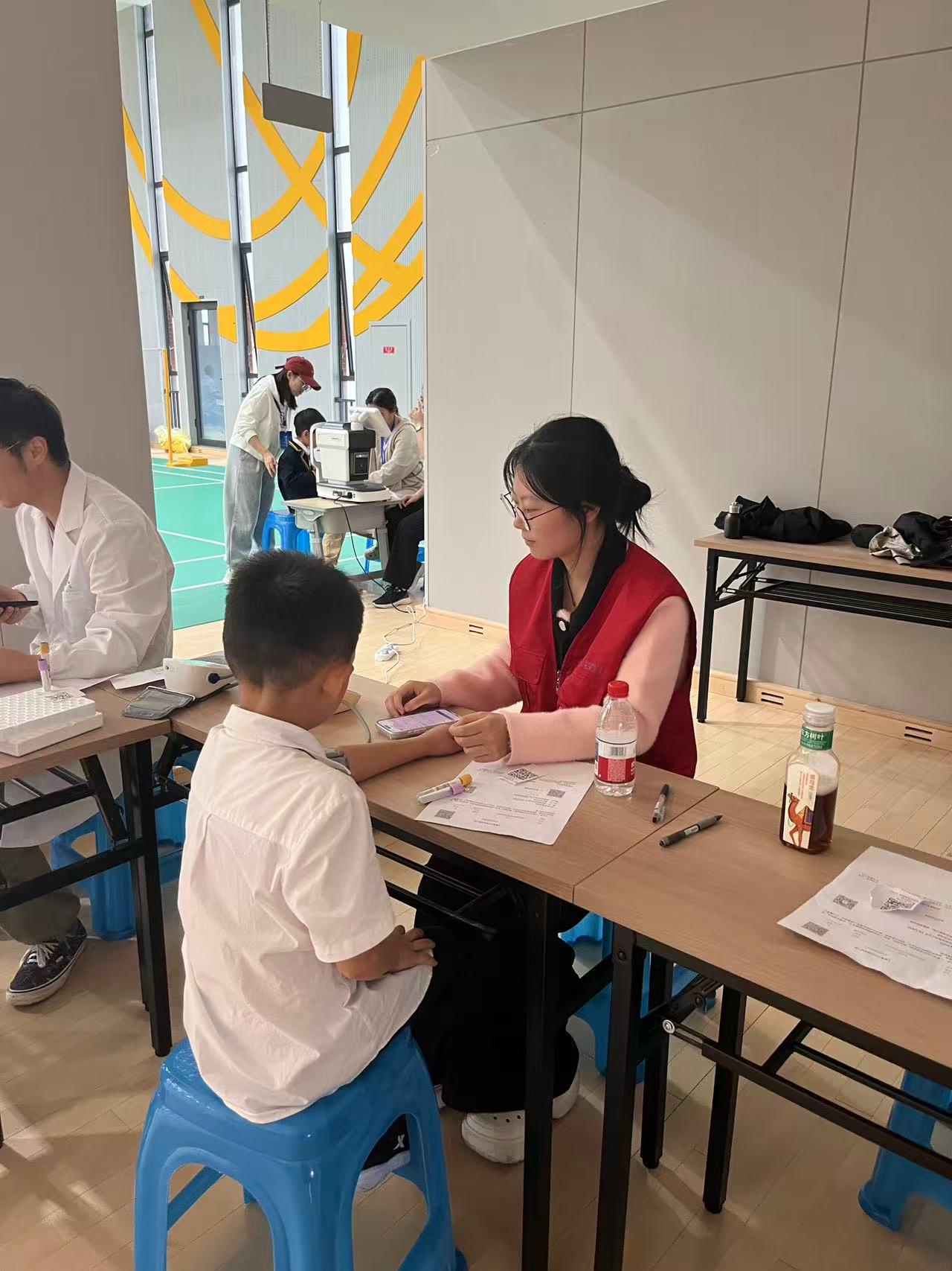 10月20、21日,一群身着红色志愿服的志愿者们在启成实验学校参与了一场为期两天的学生体检活动,用专业与爱心为孩子们的健康成长保驾护航。在视力检测区,孩子们在专人引导下有序排队,流程清晰高效。检测中,志愿者们化身 “护眼阿老师”,一边用温和的语气指导学生辨认视标,一边细致记录每一位学生的左眼、右眼视力数据;遇到视力偏弱或紧张的孩子,还会蹲下身轻声安抚,用 “多看绿树少看屏幕” 的小提醒传递护眼知识。