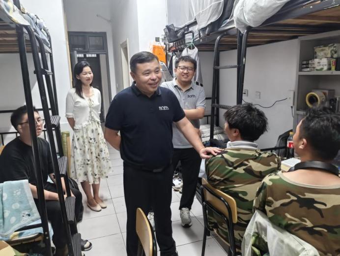 走进新生寝室,朱力明书记与同学们展开亲切交流。他耐心询问每一位新生的家乡所在地,从地方特色民俗聊到风味小吃,用轻松家常的话题迅速拉近与学生之间的距离,让刚投入军训的新生们感受到如家般的温暖。谈及已开展的军训,朱力明书记特意叮嘱:“军训是大学生涯的重要一课,既能锤炼意志、增强体魄,也能帮助大家快速熟悉彼此、培养集体意识。目前训练已逐步推进,大家要听从教官指挥,合理调整作息、注意劳逸结合,遇到身体不适务必及时向辅导员或教官反馈,学院会全力为大家提供保障。”