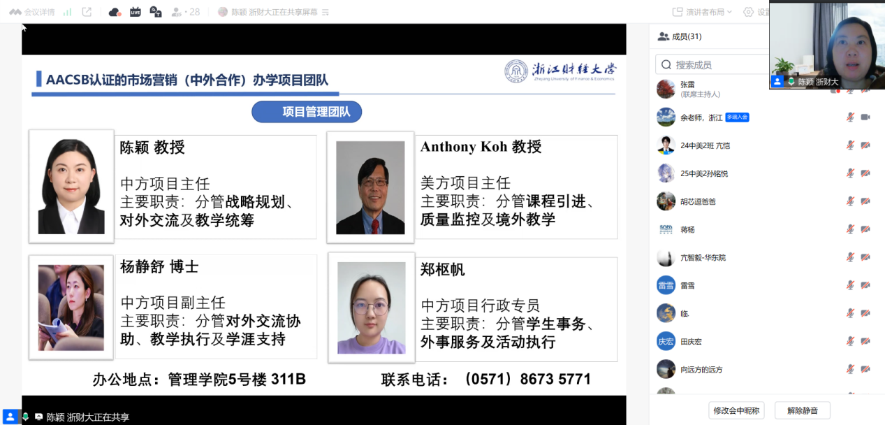 市场营销(中外合作办学项目)始业教育活动,通过线上腾讯会议+直播形式成功举办。本次活动以“美国托莱多大学留学:Why, What and How”为核心主题,汇聚学院领导、项目团队教师、美国托莱多大学代表、访学学生代表,与2024级、2025级项目学生及家长近120余位共赴云端之约,全方位解读项目优势、留学路径与成长机遇。活动由市场营销(中外合作办学项目)中方项目主任陈颖教授主持。