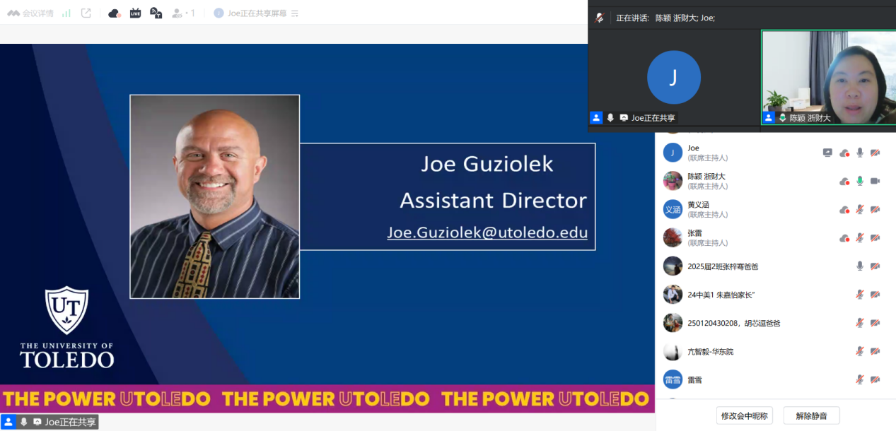 美国托莱多大学本科招生办公室代表Joe Guiziolek,通过连线分享了两校合作渊源与支持保障。学生赴美后将享有与本土学生同等的学术资源,配备专属学术导师,项目涵盖专业销售与市场营销双学位,课程排名全球顶尖,深受美国本土学生认可。