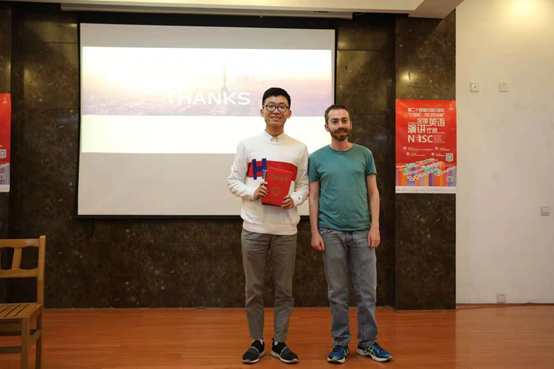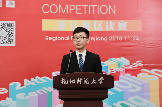 英语演讲决赛部分由3分钟的已备演讲、两分钟的即兴演讲和两分钟的评委互动问答组成。在已备演讲中,钟旭刚同学介绍了自己的家乡诸暨市大唐镇因改革开放而发生的一系列变化—袜业由父辈年轻时需要大量的人力,到自己小时候家家户户机械化生产,再到现在的互联网袜业经济。在即兴演讲中,钟旭刚结合自身经历表达了对最近流行杨超越表情包的看法。得到评委们的认可,并最终斩获浙江省三等奖。