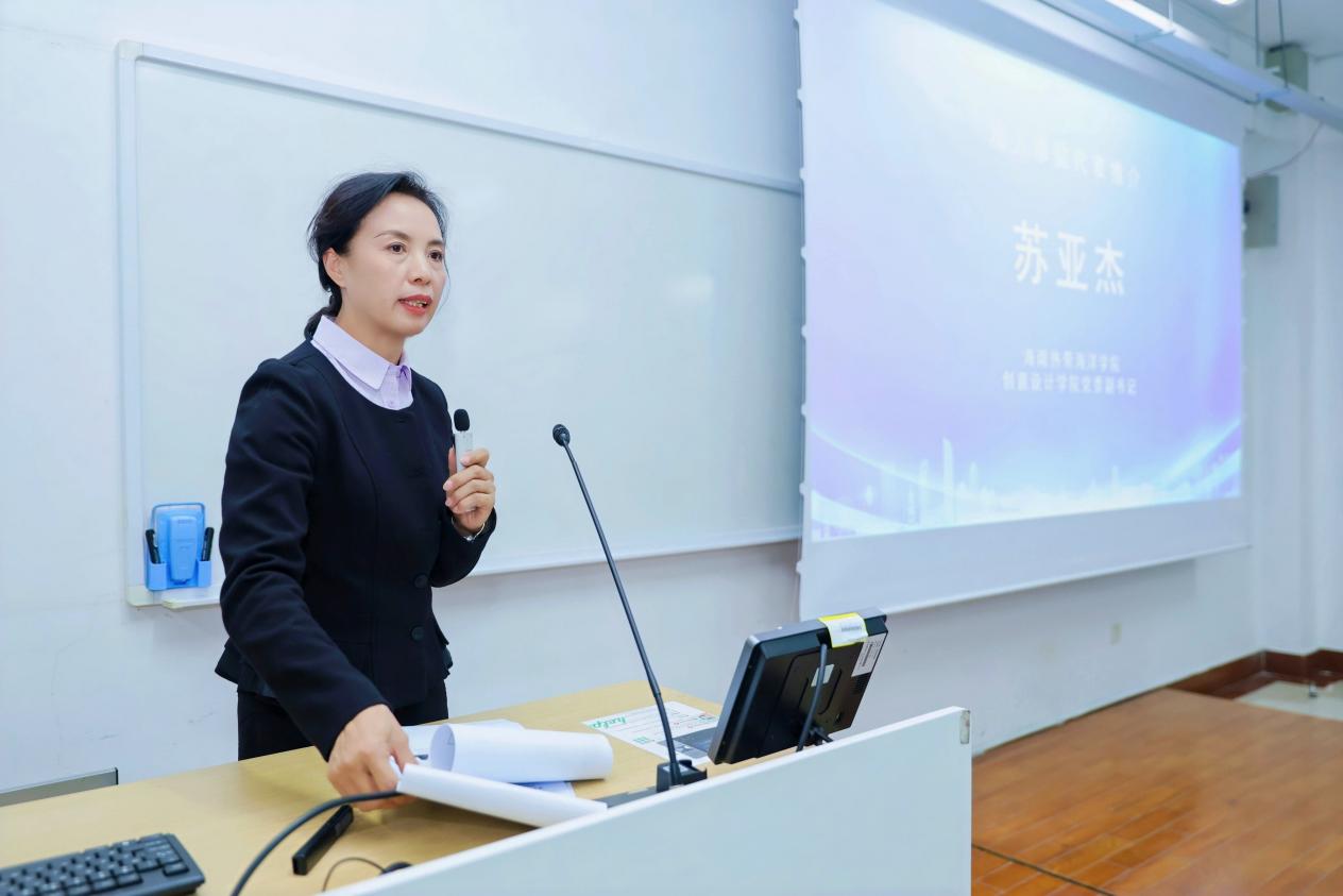 企事业单位代表——海南热带海洋学院创意设计学院党委副书记苏亚杰老师随后登台,介绍了学校的基本情况以及人才引进的计划和福利政策,展现了海南高校对优秀人才的重视与渴望。