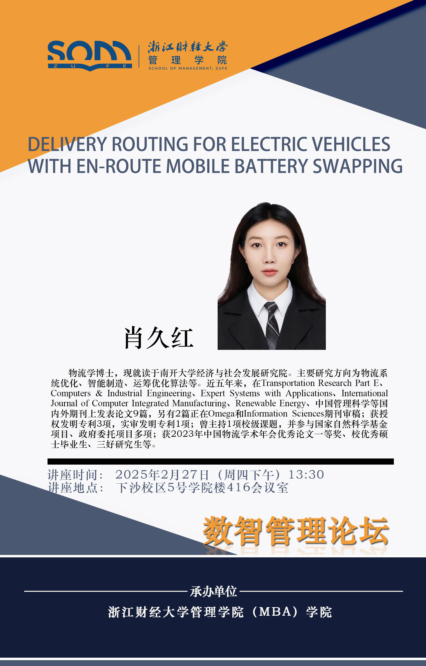 香蕉视频 新财经战略系列学术活动2025年第8期【学术报告】肖久红:Delivery routing for electric vehicles with en-route mobile battery swapping