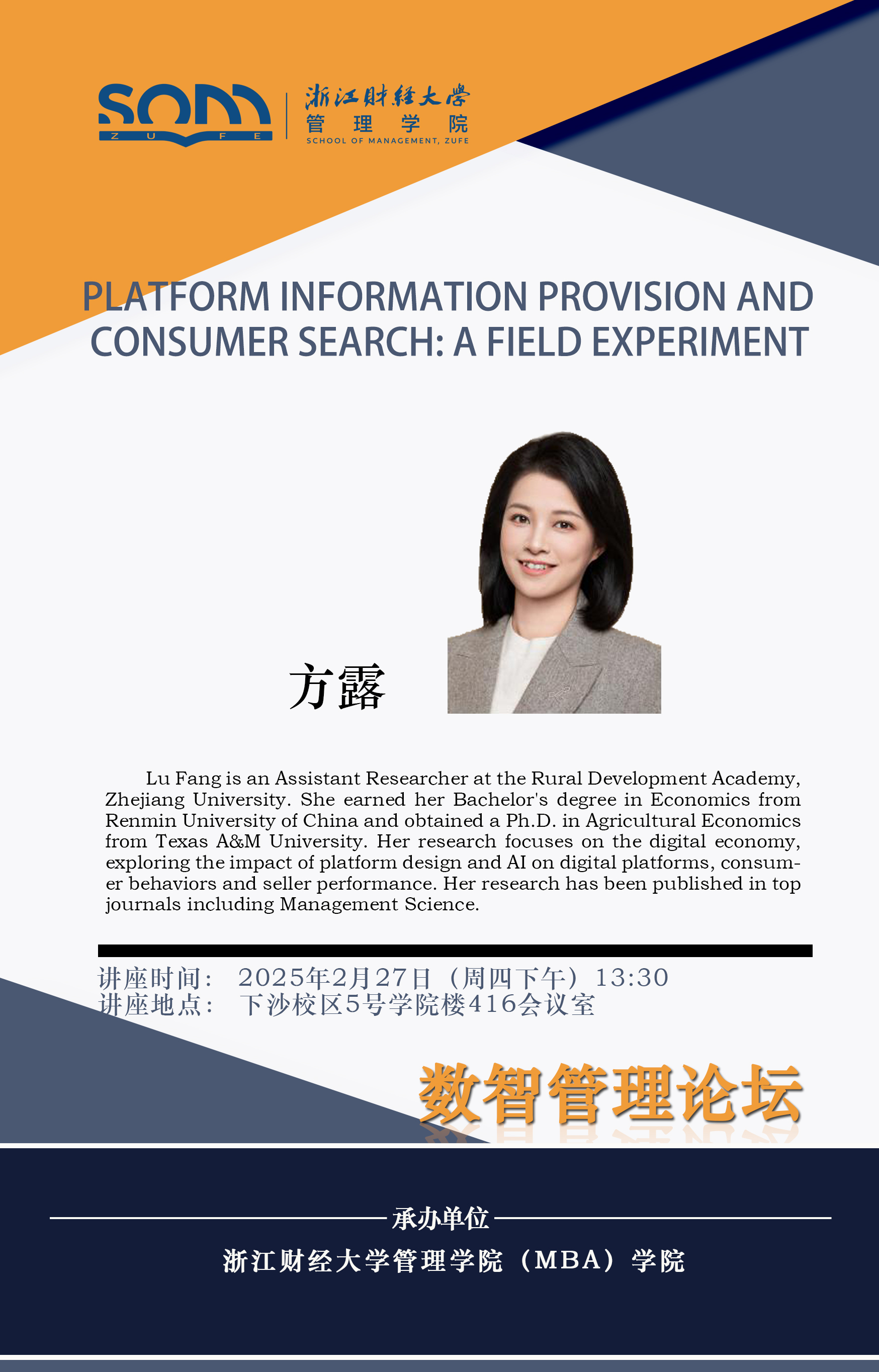 Lu Fang is an Assistant Researcher at the Rural Development Academy, Zhejiang University. She earned her Bachelor's degree in Economics from Renmin University of China and obtained a Ph.D. in Agricultural Economics from Texas A&M University. Her research focuses on the digital economy, exploring the impact of platform design and AI on digital platforms, consumer behaviors and seller performance. Her research has been published in top journals including Management Science.